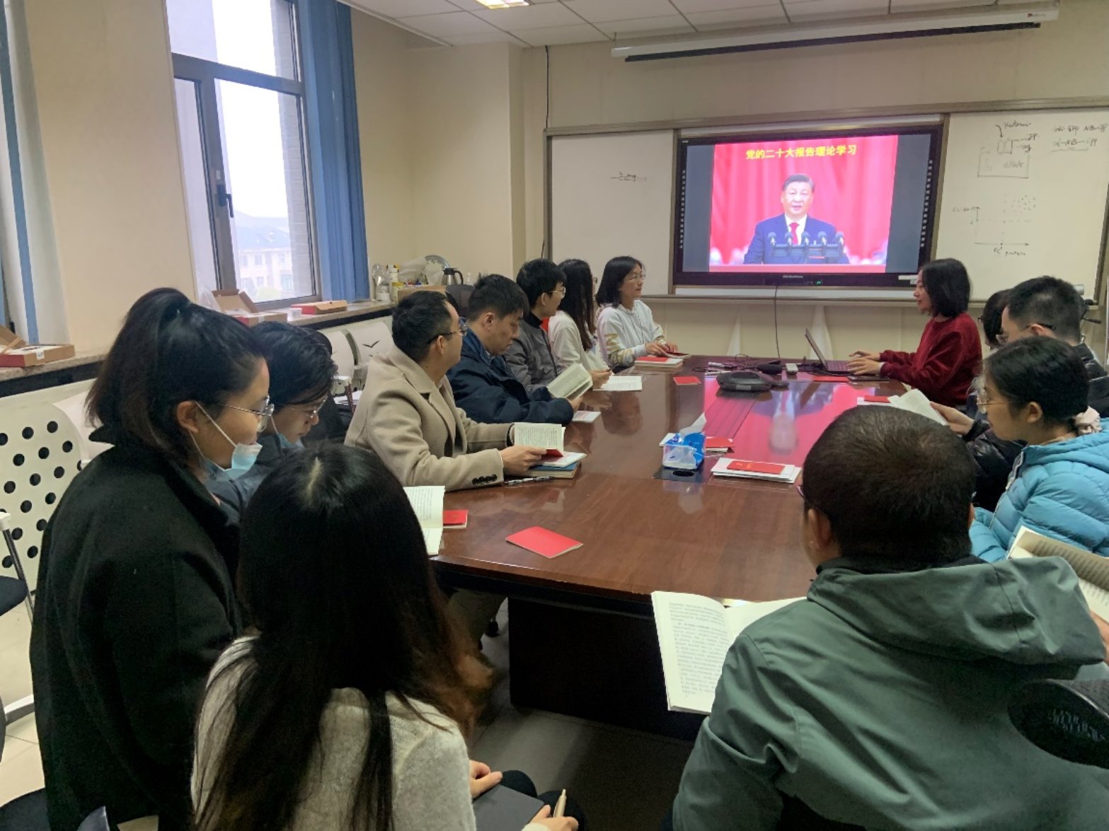 2022年11月11日,化学生物系党支部在A615会议室通过支部书记讲党课的方式集体学习党的二十大精神。