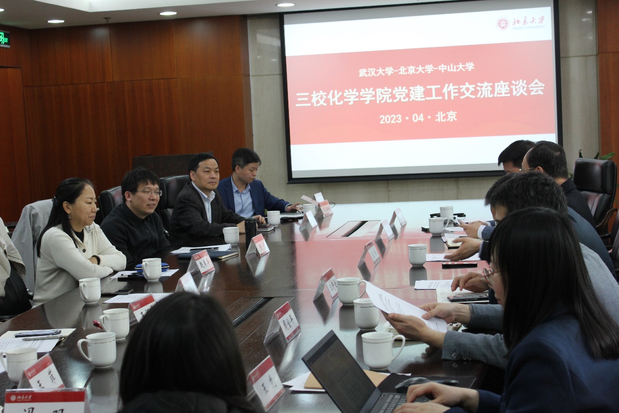 为深入学习贯彻习近平新时代中国特色社会主义思想和党的二十大精神,进一步探索新一轮“双一流”学科建设、拔尖创新人才培养、高水平科研管理服务等课题,构建三校化学学科合作共建局面,2023年4月21日,武汉大学化学与分子科学学院(以下简称武大化院)院长庄林、中山大学化学学院(以下简称中大化院)党委书记冯双带队,到北京大学化学与分子工程学院(以下简称北大化院)开展党建工作交流座谈会,会议由北大化院党委副书记赵美萍主持,三校化院领导班子和管理人员近30人参会。