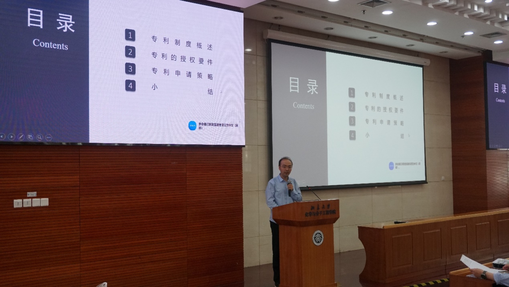 5月24日下午,北京大学知识产权专题培训第十期暨化学学院教师交流会第204期——“化学领域专利审查要点及专利申请策略”在化学楼A204会议室成功举办,化学学院副院长彭海琳教授主持培训,化学学院领导班子、科研人员、科研助理及其他感兴趣的师生参加培训。培训邀请国家知识产权局专利局医药生物发明审查部蛋白质工程处一级主任科员、四级审查员张临政进行专题授课。本次培训授课内容从专利制度概述、专利的授权要件、专利申请策略三个方面展开,对专利制度的演进与设计理念、专利审查中关注的要点以及相应的申请策略进行详细讲解,分析了发明专利与其他科技成果之间的本质区别,还以北大化学领域已审结案件为典型案例,分析师生在文献检索、申请文件撰写与审查意见答复中容易出现的问题并提出改进建议。