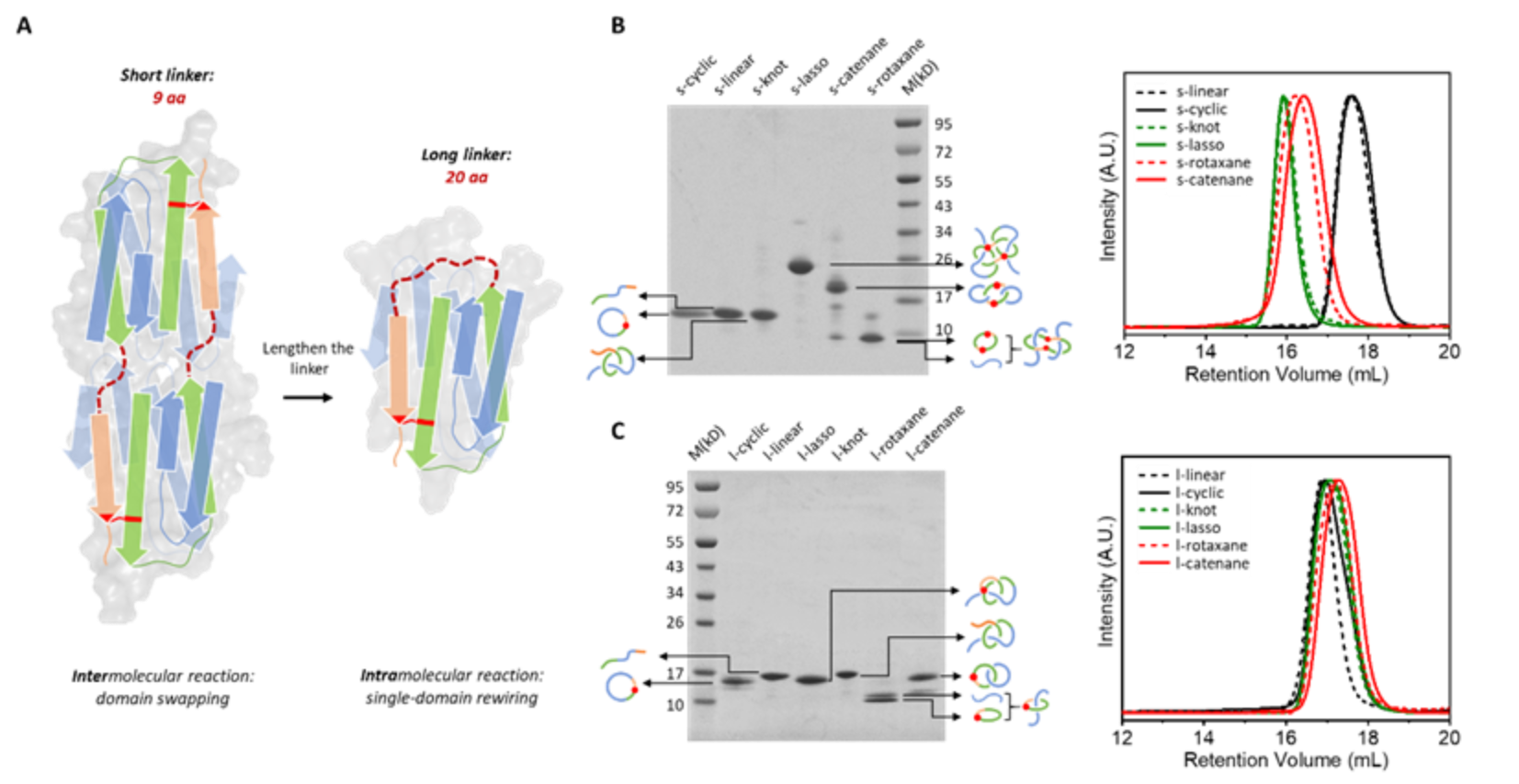 Fig. 2 (A) Intramolecular reconstitution and domain swapping are influenced by the length of the linker. A short linker length promotes domain swapping and a long linker length promotes intramolecular reconstitution. (B) SDS-PAGE analysis and SEC trace of purified topological proteins with short linkers. (C) SDS-PAGE analysis and SEC trace of purified topological proteins with long linkers.