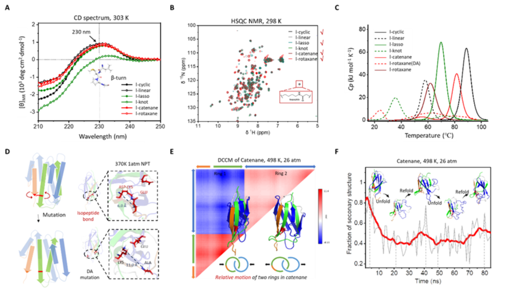Fig. 3 (A) CD spectra of topological proteins at 303 K. (B) Overlay of HSQC NMR spectra of topological proteins. (C) DSC curves of seven topological proteins. (D) Distance of residues at the isopeptide bonding site during simulation with stick illustration of the Lys and mutated Ala residues. (E) Dynamic cross-correlation matrix (DCCM) of protein catenane at 498 K and 26 atm, shows the relative motion between the two rings. (F) Fraction of secondary structure of catenane during simulation at 498 K and 26 atm, and representative structures captured from unfolding trajectories showing the cycles of unfolding and refolding during simulation.