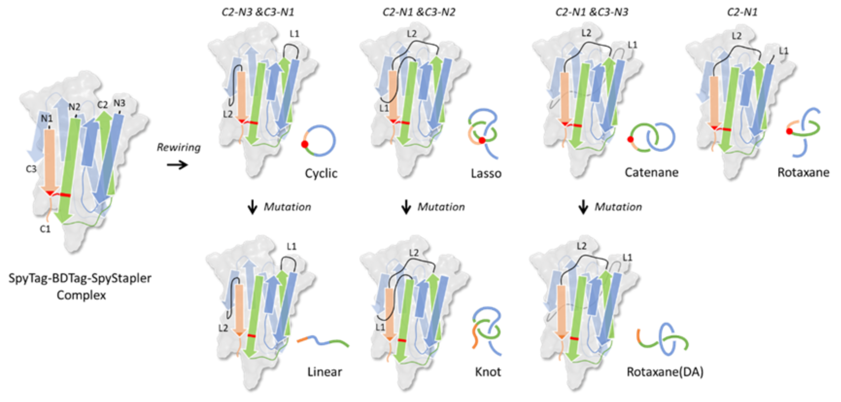 The SpyTag-SpyCatcher complex is robust and can tolerate extensive protein engineering. It has been successfully split into three parts, namely, SpyTag, BDTag, and SpyStapler. Upon reconstitution, SpyStapler can still catalyze the isopeptide bonding between SpyTag and BDTag. By rewiring the connectivity of their N- and C-terminus (N1/C1 of SpyTag, N2/C2 of BDTag, and N3/C3 of SpyStapler) to introduce entanglement and mutating the reactive residue on SpyTag to abolish the isopeptide bonding, a series of protein folds with distinct chemical topology can be designed (Fig. 1).