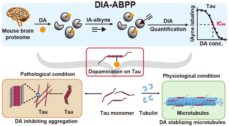 In summary, a quantitative chemoproteomic platform was developed to identify and quantify dopamination sites in the mouse brain. The highly conserved cysteines of Tau were proven to be dopaminated, and this modification prevented Tau’s amyloid fibrillation and promoted Tau-mediated assembly of microtubules.This study not only provides a global portrait of dopamination but also discovers a protective role of DA in regulating the function of Tau, enhancing our understanding of the physiological and pathological functions of DA in the human brain. It also holds significant guiding importance for the development of drugs targeting Tau.