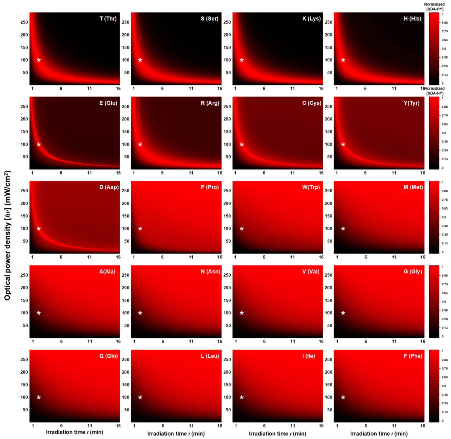 Fig.4 Preferences of alkyl diazirine for protein residues vary at various combinations of irradiation time and power density.