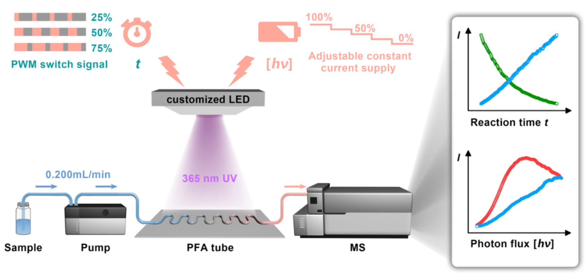 Fig.2 Real-time photoreaction setup with online mass spectrometry (MS) monitoring, capable of simultaneously adjusting light power density and photoreaction time.