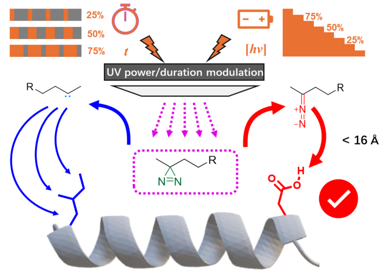 Prof. Tang's research group at Peking University has made a breakthrough in understanding the photoreaction mechanism of diazirines, commonly used photo-crosslinkers in protein structural analysis. Diazirines, characterized by their unique three-membered ring structure, generate highly reactive intermediates upon exposure to light. These intermediates have broad applications in photochemistry. However, their photoreaction mechanism has long been assumed to primarily involve carbene intermediates, which interact indiscriminately with protein residues. The details of alkyl diazirine reaction mechanism, particularly the existence of other potential intermediates and their preferences towards protein residues, have remained largely unknown. The work from Prof. Tang’s group, now published in Nature Communications (Nat. Commun. 2024, 15, 6060) titled “Dissecting Diazirine Photo-Reaction Mechanism for Protein Residue-Specific Cross-Linking and Distance Mapping”, reveals a nuanced reaction process that can be leveraged to achieve precise identification of protein conjugations sites. Their research demonstrates that the precision of diazirine application in protein structural photolabeling mass spectrometry can match that of traditional chemical crosslinking methods.