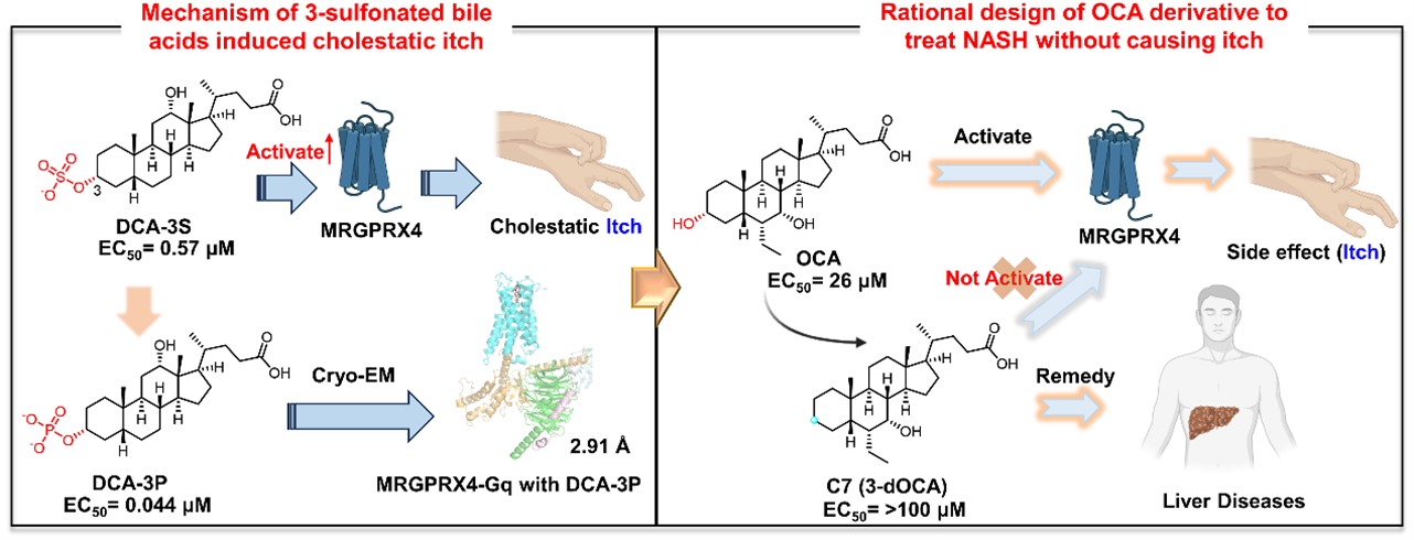 The research teams utilized LC/MS-MS technology to analyze bile acid components in the plasma of cholestasis patients with or without itch symptoms. Additionally, the teams employed cryo-EM to reveal the mechanism of bile acids activating MRGPRX4 (hX4). In addition to investigating bile acids and pruritus mechanisms, the researchers also examined the mechanism behind the itching side effects associated with the clinical drug obeticholic acid (OCA). They identified OCA’s target linked to itch at the cellular level and validated this mechanism in animal models and human subjects. Ultimately, using the structure and mechanistic insight, the teams designed a new compound that retains OCA’s therapeutic effect without causing the itch.