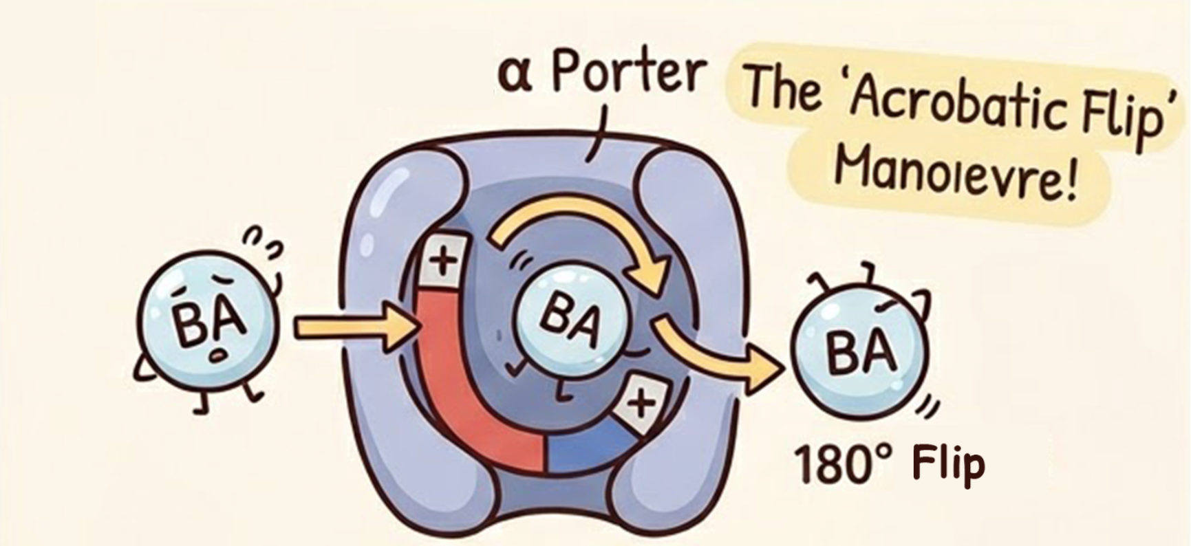 The molecule doesn't just slide through; it performs a graceful 180° gymnastic flip. This "Acrobatic Manoeuvre" ensures the recycling is both lightning-fast and incredibly energy-efficient. The machine doesn't even need "batteries" (cellular energy); it simply lets the molecules slide down a concentration gradient like a playground slide.
