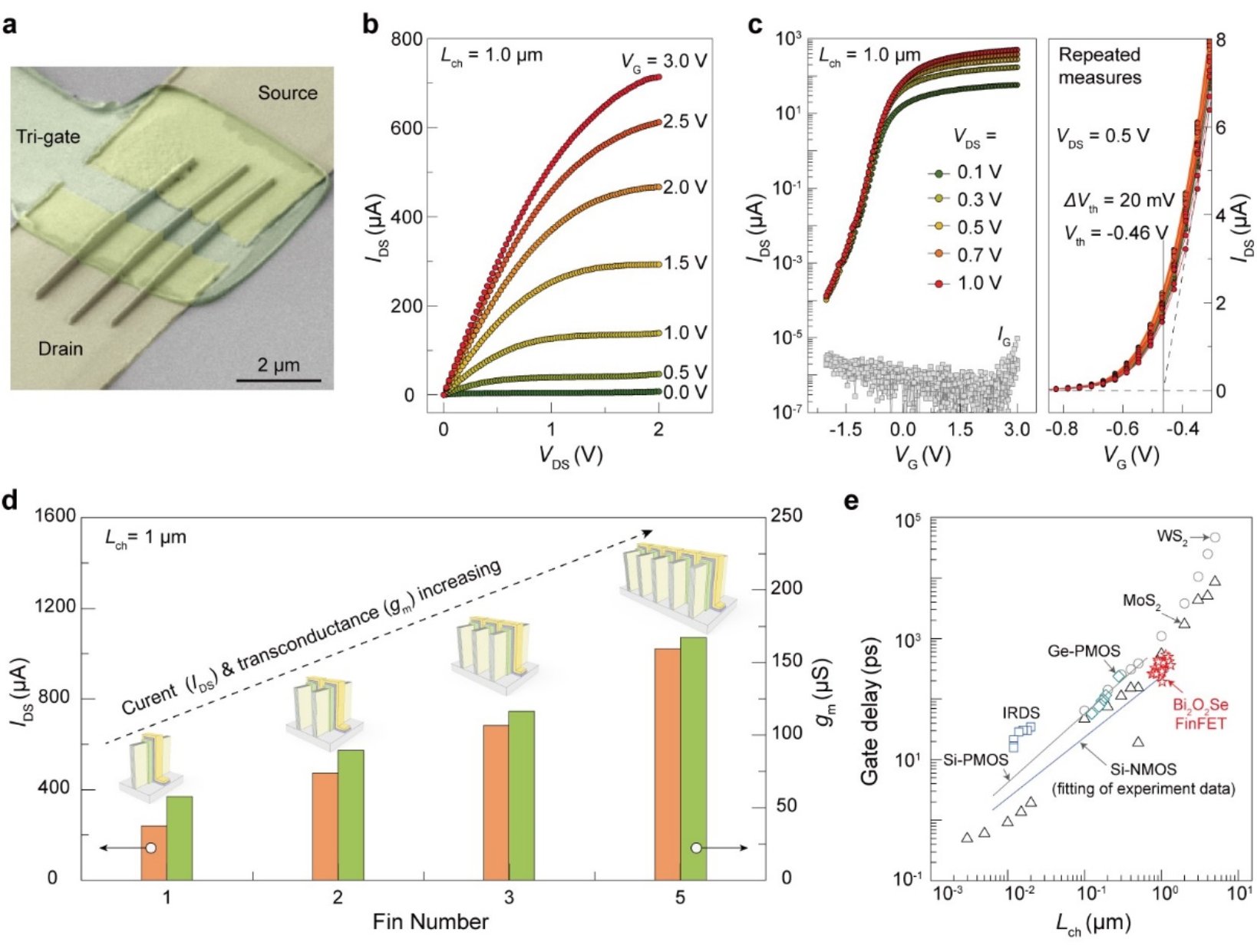 图2. 多通道二维鳍式晶体管电学性能。(a)三通道二维鳍式晶体管扫描电镜图像;(b)图a中器件的输出特性曲线;(c)图a中器件的转移特性曲线;(d)基于不同数量鳍片构筑的二维鳍式晶体管开态电流与跨导比较;(e)多通道二维鳍式晶体管与其他晶体管的延迟时间比较。