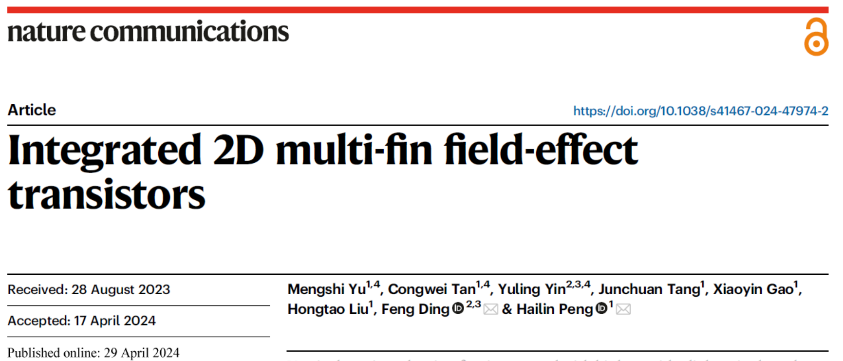 Nature Commun. | 彭海琳课题组与合作者在集成型多通道二维鳍式晶体管研究中取得进展