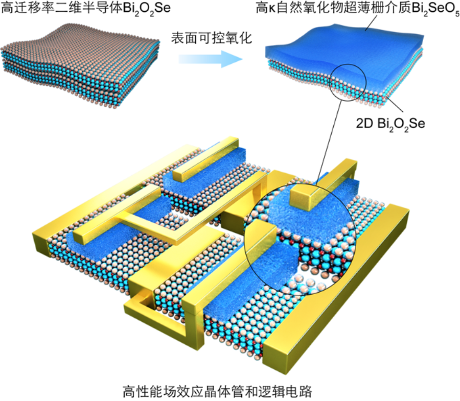 图1. 高迁移率二维半导体/高κ自然氧化物栅介质(Bi2O2Se/Bi2SeO5)异质结构筑与逻辑器件原理图