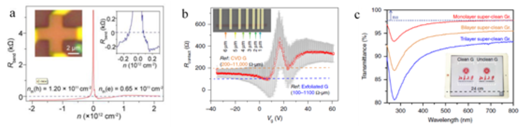 图1. 超洁净石墨烯优异的性质。(a)高的迁移率(b)低的接触电阻(c)高的透光性