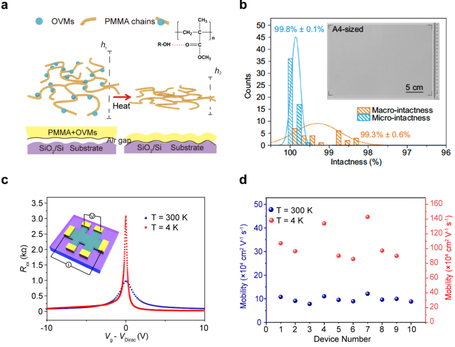 文章指出,石墨烯薄膜成功转移的关键是通过转移媒介的结构设计,实现其与目标衬底之间的共形接触。由于石墨烯和目标衬底的良好贴合,可以有效避免转移中石墨烯受到应力而产生的破损和褶皱问题。对于硅基衬底,研究团队设计了含羟基的挥发性小分子嵌入聚甲基丙烯酸甲酯(PMMA)链中作为转移媒介,通过加热,小分子挥发,导致PMMA链重新堆叠,推动石墨烯和目标衬底共形贴合,成功实现4英寸晶圆石墨烯完整转移。对于粗糙度较高的聚对苯二甲酸乙二醇酯(polyethylene glycol terephthalate, PET)衬底,通过将低玻璃化转变温度的聚碳酸亚丙酯嵌入PMMA链中,加热后聚合物玻璃化转变使得石墨烯在PET表面铺展浸润,可以成功实现A4尺寸石墨烯薄膜的完整转移,完整度可达99%。