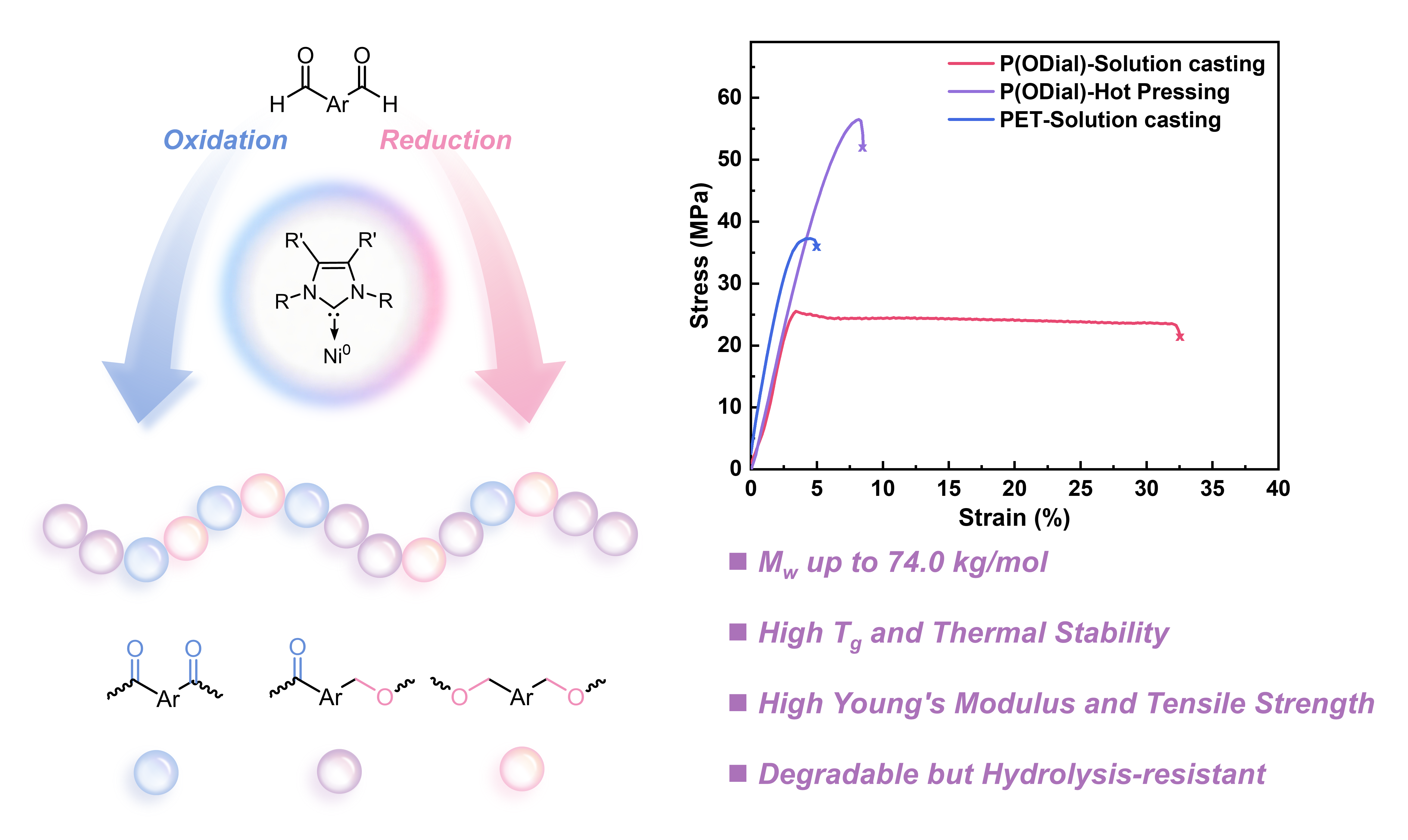 该研究证明,Ni(0)/NHC催化的CDP策略为利用易得芳香二醛单体构建高性能芳香聚酯提供了一条高效而普适的新途径。该方法为聚合物结构与性能的精细调控提供了新平台,有望推动耐热、易加工且可降解/可回收高分子材料的理性设计与应用。