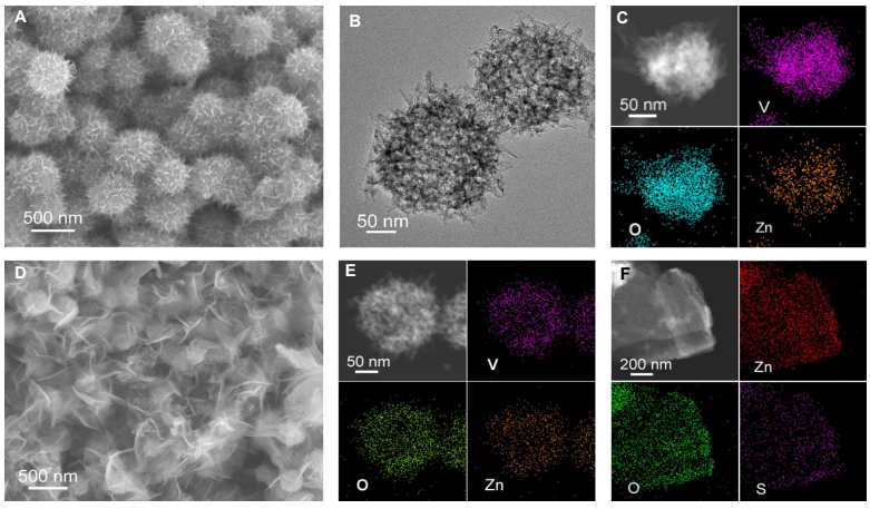 图1. Zn0.3V2O5•1.5H2O正极材料在充放电过程中形貌和组成分析。