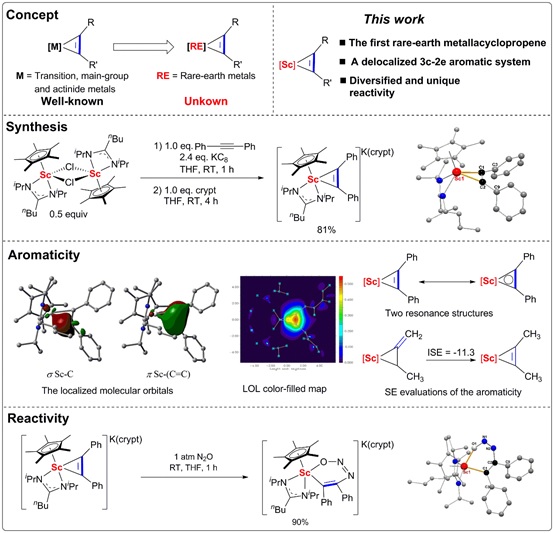 在前期研究稀土金属钪杂环戊二烯发生骨架重排构建双卡宾钪配合物反应中(Wangyang Ma, Chao Yu, Yue Chi, Tianyang Chen, Lianjun Wang, Jianhao Yin, Baosheng Wei, Ling Xu, Wen-Xiong Zhang,* and Zhenfeng Xi, Formation and Ligand-Based Reductive Chemistry of Bridged Bis-alkylidene Scandium(III) Complexes, Chem. Sci. 2017, 8, 6852-6856.),他们创新性地提出该反应可能经历钪杂环丙烯中间体,一类稀土金属有机配合物中未知的物种。此后,他们一直尝试通过从反应体系中分离或金属有机化学手段合成,来证实该类配合物的存在。另外,在研究稀土金属钪促进的氮气活化中,他们实现了双氯桥联钪配合物被金属钾还原可实现氮气活化制备侧基配位的双核(N2)2−,(N2)3−-钪氮杂环(Ze-Jie Lv, Zhe Huang, Wen-Xiong Zhang,* and Zhenfeng Xi,* Scandium-Promoted Direct Conversion of Dinitrogen into Hydrazine Derivatives via N−C Bond Formation. J. Am. Chem. Soc. 2019, 141, 8773-8777.)。这些前期工作启发他们利用双氯桥联钪配合物和石墨钾体系去还原炔烃。经过近三年的探索,他们成功合成和分离了首例钪杂环丙烯。进一步的实验和理论研究表明该钪杂环丙烯存在三中心-两电子(3c-2e)的芳香体系,这也是首例稀土金属芳香性杂环化合物。通过反应性研究发现该钪杂环丙烯存在多样和独特的反应化学,例如,可与三甲基硅基异氰酸酯(TMSNCO)和笑气(N2O)发生插入反应得到新颖的钪杂五元环和六元环;可与三甲基硅基叠氮(TMSN3)发生取代反应得到钪-双叠氮配合物等,这些反应与其它金属杂环丙烯的反应截然不同。