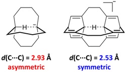 然而,在上述例子中具有对称氢键的结构并不是体系的能量极小点。因此,接下来他们开始着手于利用理论计算设计一些更加合理的对称C···H···C氢键。为了将两个碳原子之间的距离固定在2.5 Å附近,作者参考了质子化1,6-二氮杂双环[4.4.4]十四烷(1;其结构如图1b所示)中的对称N···H···N氢键。在该结构中,两个氮原子之间的距离为2.53 Å。他们试图通过设计分子内C···H···C氢键,并利用环张力强迫两个碳原子靠近(图3;左)。但是,这一策略并未取得成功。经过几何优化,作者发现体系能量极小点中的C−H···C氢键是非对称的,且两个碳原子之间的距离长达2.93 Å。为了进一步缩短两个碳原子之间的距离,作者通过引入笼状结构(例如桶烯)进一步增加了体系的环张力。如图3(右)所示,此时体系能量极小点中两个碳原子之间的距离仅为2.53 Å,且C···H···C氢键是对称的。至此,作者成功例证了对称C···H···C氢键存在的可能性。