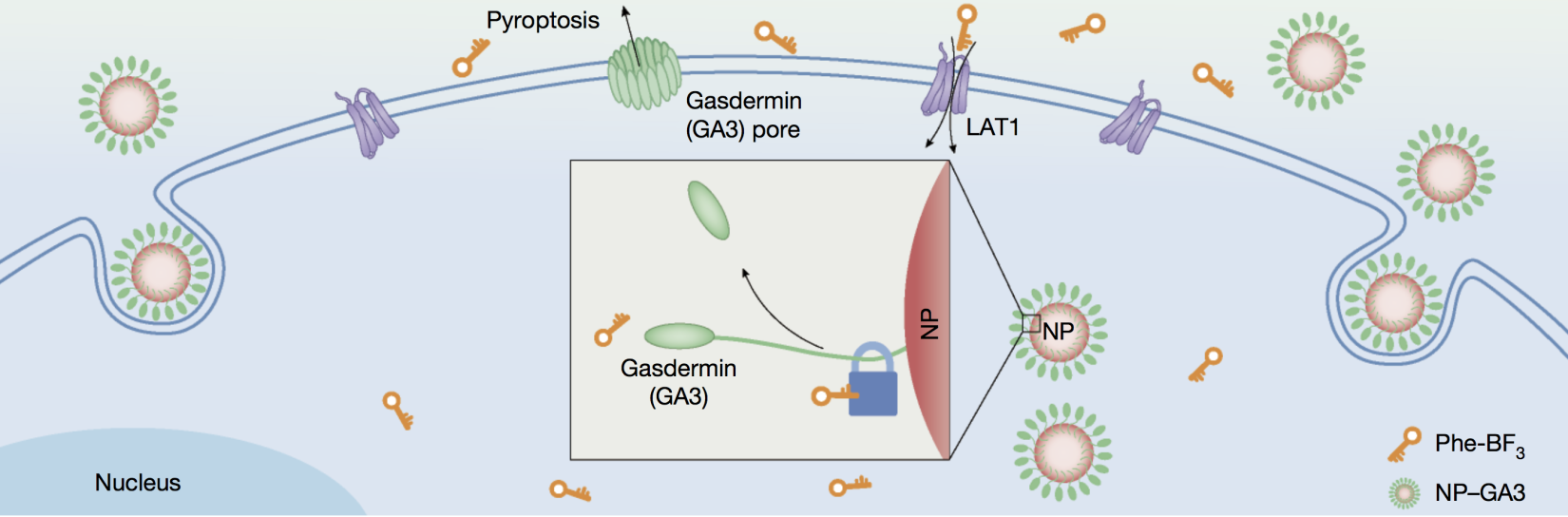 2020年3月11日,我院应用化学系刘志博课题组和北京生命科学研究所邵峰实验室合作在Nature杂志在线发表题为A bioorthogonal system reveals antitumour immune function of pyroptosis的文章。在前期工作中,刘志博实验室发现一类含硼氨基酸探针(18F-硼氨酸)在肿瘤上有显著且特异的摄取,并将其用于临床中脑瘤的早期诊断和精确划界。在该项研究中,研究人员发现硼氨酸上的三氟化硼基团可直接用于硅烷(silyl ether)的脱除反应。在此基础上,研究人员在细胞以及活体水平上构建了苯丙硼氨酸(Phe-BF3)介导的生物正交剪切系统,赋予硼氨酸探针激活功能,并通过“双靶向激活”策略实现了肿瘤选择性的蛋白功能调控。该系统具有普适性,但对于需要在肿瘤细胞内选择性释放的蛋白更具优势,而Gasdermin蛋白就是一个范例。邵峰实验室近年研究发现Gasdermin家族蛋白是细胞焦亡的执行分子。Gasdermin蛋白在细胞内被激活后,其N端结构域在细胞膜上寡聚成孔,最终导致细胞裂解性死亡,诱导强烈的炎症反应。研究人员将该生物正交系统应用到Gasdermin蛋白后,实现了肿瘤原位且可控性地激活细胞焦亡。进一步研究发现,在肿瘤中引发细胞焦亡可诱导机体高效的抗肿瘤免疫活性进而清除肿瘤。