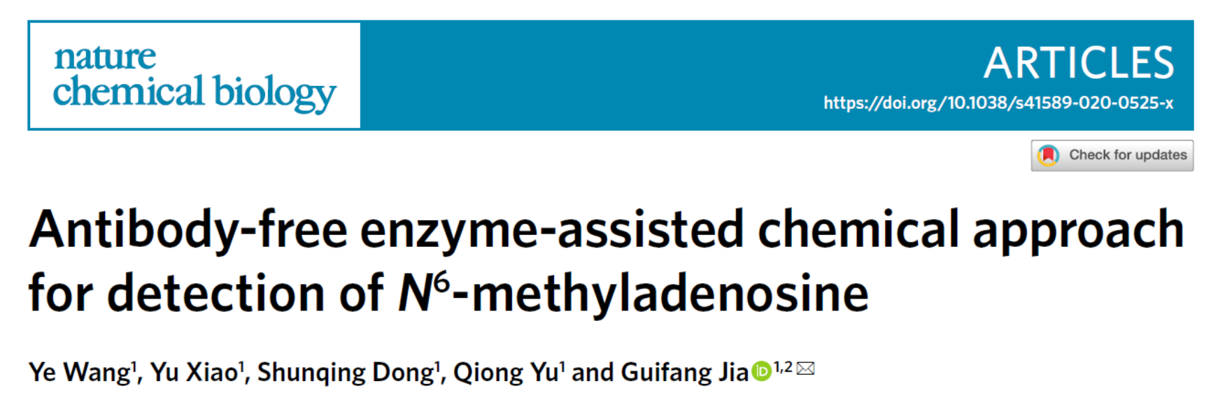 2020年4月27日,北京大学化学与分子工程学院贾桂芳该课题组在Nature子刊《Nature Chemical Biology》在线发表了题为“Antibody-free enzyme-assisted chemical approach for detection of N6-methyladenosin”的研究论文,首次报道了利用FTO酶辅助实现了RNA修饰m6A的化学标记,并成功应用于全转录组m6A的高通量测序。