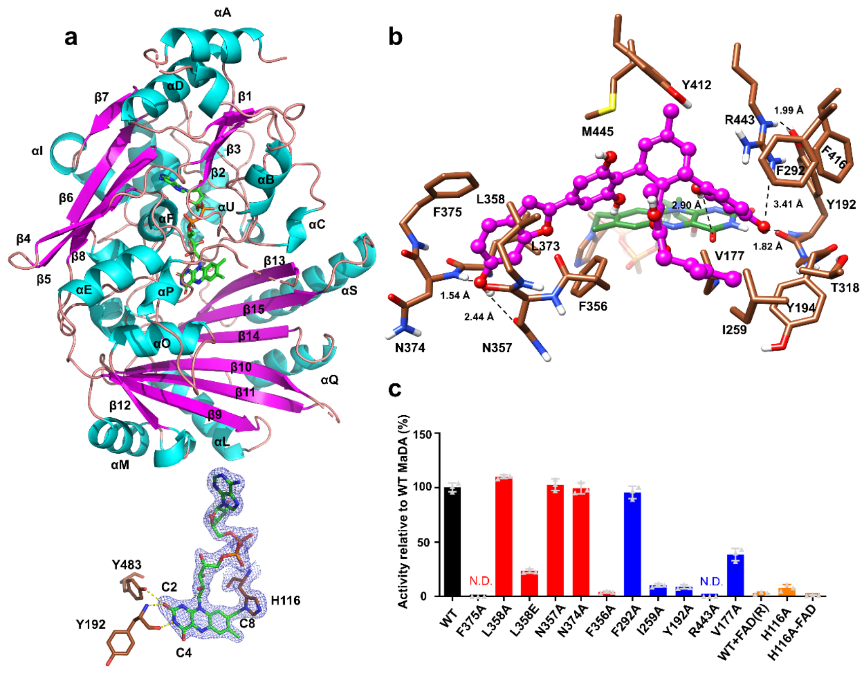 图2:基于MaDA晶体结构的分子对接以及点突变实验揭示了MaDA与底物形成相互作用的关键位点