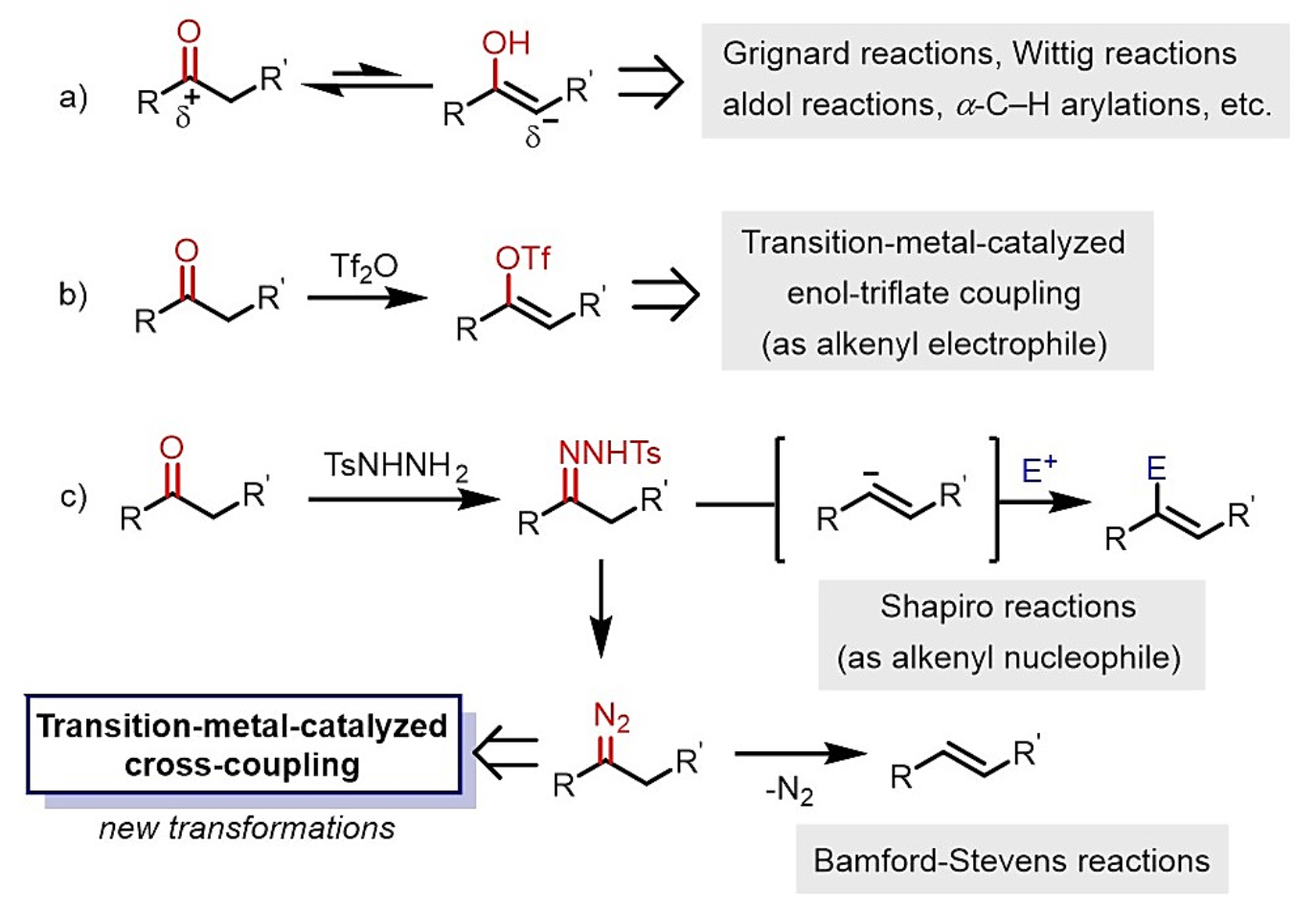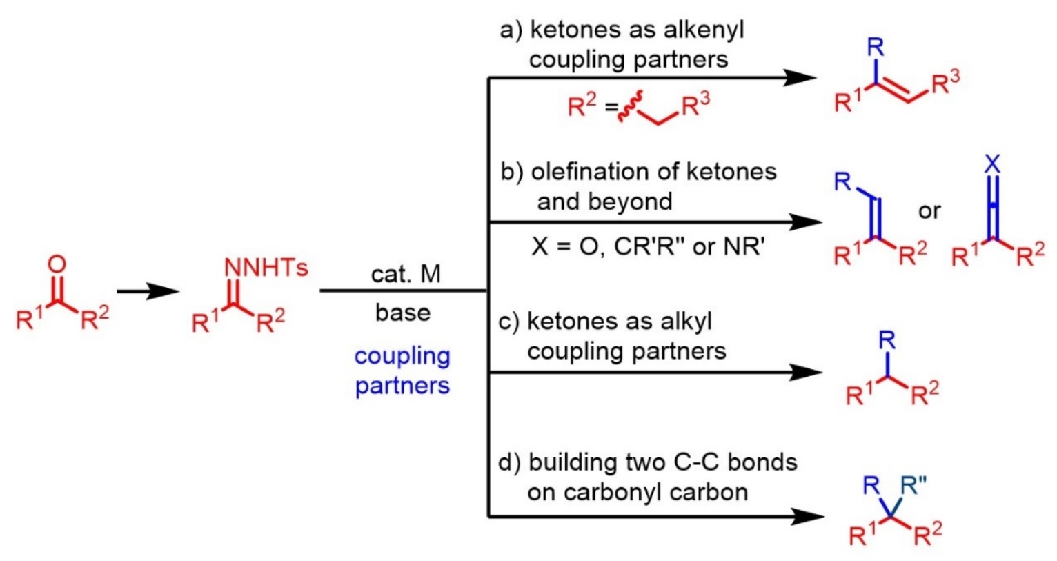 醛酮等羰基化合物作为最基本的化合物在有机合成中扮演着非常重要的角色。醛酮丰富的反应活性主要来源于羰基碳的亲电性和α-氢的酸性。例如,有机合成中应用非常广泛的反应,包括格式试剂加成反应、魏悌息反应、羟醛缩合反应和α-碳氢键烷基化、芳基化反应等等,都与醛酮的这些性质相关。如果将醛酮转化为相应的三氟甲磺酸烯醇酯(-OTf),则其可以作为烯基亲电试剂在过渡金属催化下参与偶联反应。这是一类已发展完善的间接利用醛酮作为偶联组分的方法。此外,通过将醛酮与对甲苯磺酰肼(TsNHNH2)简单缩合得到的对甲苯磺酰腙(=NNHTs),也是一类非常重要的合成子,其可以经由Shapiro反应和Bamford-Stevens反应得到官能团化的烯烃。特别是Shapiro反应可以将酮转化为烯基亲核试剂来参与反应,这一特殊的转化模式在有机合成中得到了很多应用,例如,该反应是紫杉醇全合成中的关键步骤之一。