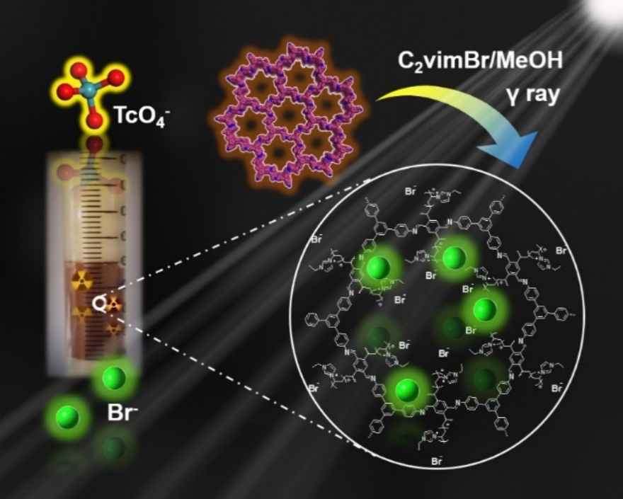 共价有机框架(Covalent Organic Frameworks, COFs)材料是一类具有二维或三维延伸结构、周期性和结晶性的多孔有机聚合物,其结构单元通过强共价键连接。因其结构的多样性、永久的多孔性和优异的稳定性,这类材料在能源、催化、分离等领域均有着重要的应用前景。99Tc是一种半衰期长、毒性大的放射性核素,在水溶液中以TcO4−形式存在。在乏燃料后处理和核环境修复等领域,设计合成具有优异TcO4−捕获性能的阴离子分离材料仍然是一个重大挑战。