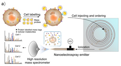 单细胞中内容物体积少、含量低、种类多、分析窗口有限,使得高灵敏、高信息覆盖度、快速、高通量的单细胞分析面临重大挑战。通过单次测量实现多维度、多参数的单细胞定量信息获取,对于细胞分型、鉴定以及单细胞水平的疾病相关分子机制研究具有重要意义。单细胞测序技术方兴未艾,但针对单细胞中蛋白质和代谢物的分析技术仍非常有限,尤其是大量蛋白质和代谢物的同时分析尚未见报道。荧光流式细胞术可对单细胞中多种蛋白质进行分析,然而光谱带宽重叠问题限制了其同时测定的通道数。以CyTOF为代表的质谱流式细胞仪可实现单细胞中40余种蛋白质的同时定量分析,但其依赖于ICP-MS仪器,且ICP-MS无法提供细胞内源物质结构信息,极大地限制了方法的检测对象;有机质谱的结构鉴定能力强、质量分辨率高,可实现单细胞中小分子代谢物的分析。基于有机质谱建立流式细胞分析新方法,从而获取单细胞中蛋白组、代谢组等多组学信息,在单细胞异质性相关研究具有不可替代的分析优势。