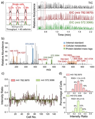 该工作中设计并合成了一系列基于罗丹明质量标签的质谱探针,对单细胞表面的CA125,CEA,EpCAM,CD24,CD44和CD133等重要的蛋白标志物进行标记;标记的细胞利用基于迪恩流的微芯片实现单细胞排列,并利用nanoESI-HRMS实现单细胞检测。离子化过程中可实现质量标签的高效解离和细胞内容物的有效释放,从而确保了单细胞中蛋白质和代谢物信息的同时获取。该质谱流式分析平台成功实现了单细胞水平6种目标蛋白质及84种代谢物的同时检测,证实了蛋白质和代谢物在细胞个体间的显著差异性(图2)。
