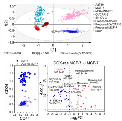 基于该多维度有机质谱流式细胞分析平台所获取的信息,工作首次同时利用蛋白质及代谢物信息作为细胞分型依据,在5种肿瘤细胞的PCA分析中获得了更好的鉴定和分型结果。在利用Ward’s法得到的聚类结果中,相比于利用单一的蛋白质或代谢物信息,使用蛋白质和代谢物的综合信息能够获得更高的分型灵敏度和特异性。单细胞分析方法在干细胞研究、细胞耐药性研究以及癌症治疗等方面具有重要意义,该流式平台还成功实现了肿瘤细胞耐药异质性分析,其结果有望为分子水平的耐药性细胞研究或癌症干细胞研究提供分析依据(图3)。