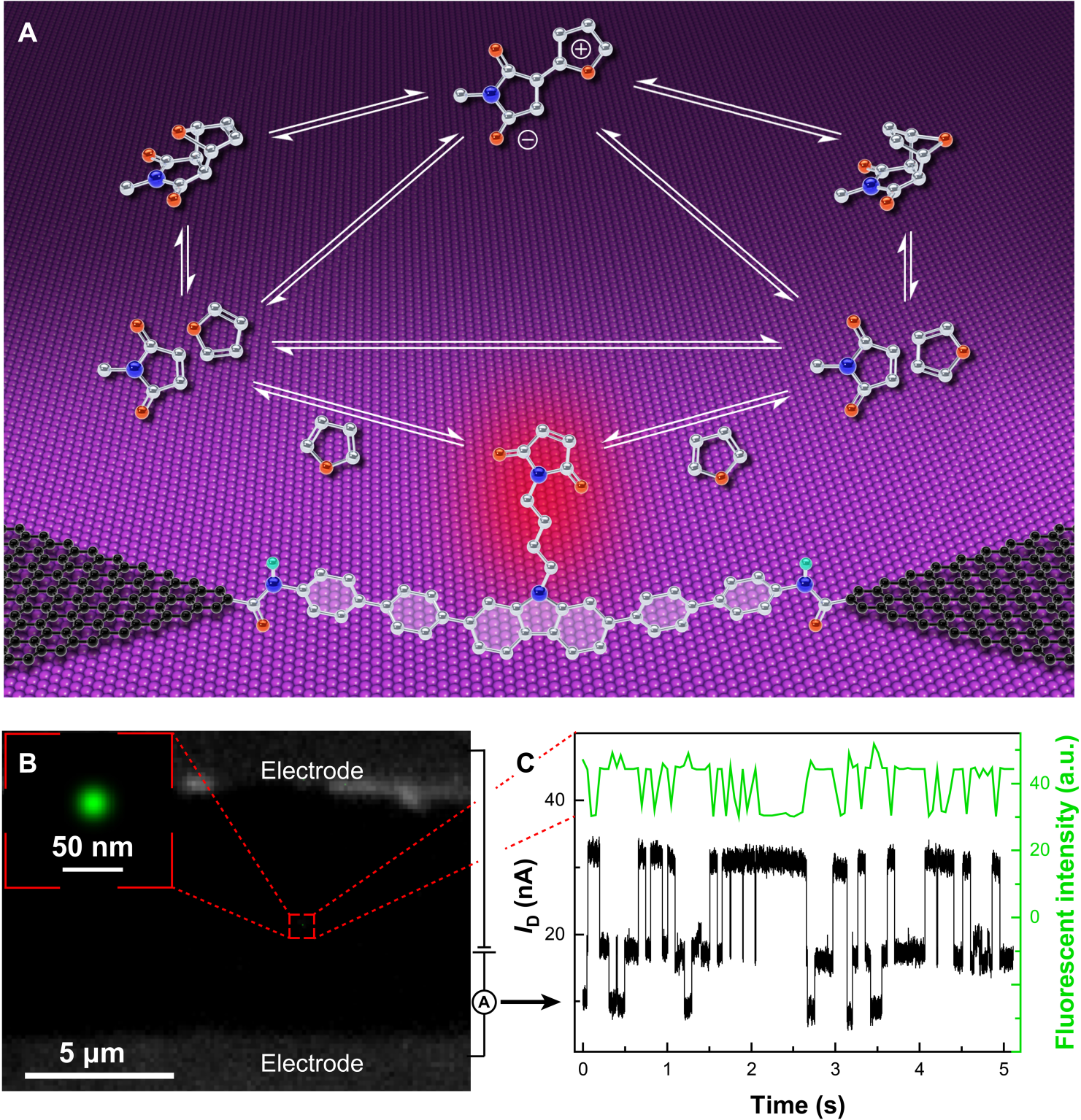 “分步”和“协同”是我们对于多步骤化学反应的分类,然而这两者在动力学上并没有绝对的分界。超出时间分辨率的多步反应通常会被简化为“协同”过程,而对于中间体的检出则成为判定“分步”过程的依据。对于经典的Diels-Alder加成反应,在教科书里其一步周环的协同反应过程已经广为人知。而该机理并非绝对,传统的方法难以检测到快速痕量的反应轨迹。而且,对分步与协同路径的有效调控存在巨大挑战。最近,北京大学化学与分子工程学院郭雪峰课题组、中科院化学研究所张德清课题组以及加利福尼亚大学洛杉矶分校Kendall N. Houk课题组合作发展了一种基于单分子器件平台的单分子电学检测及调控新方法和新技术,获得了证明单分子器件的明确实验证据,实现了在单分子水平上对于分步Diels-Alder反应动力学的研究与调控(图1)。