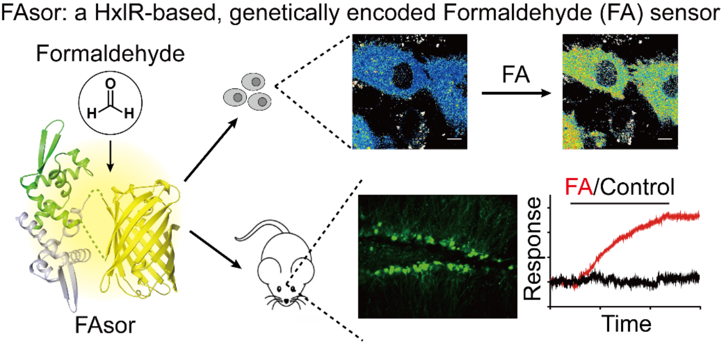 针对上述问题,北京大学化学与分子工程学院、北大-清华生命科学联合中心陈鹏课题组着手对一个独特的甲醛响应的转录因子HxlR进行了深入研究,首次从结构与化学机理上揭示了甲醛诱导HxlR蛋白发生分子内交联反应,所产生的“亚甲基桥”(methylene bridge)这一特殊化学修饰使HxlR产生功能获得性(gain-of-function)生理响应。基于这一发现,他们开发了首个可遗传编码的甲醛荧光探针(FAsor),成功应用于检测活细胞以及小鼠脑组织切片中甲醛的动态变化。相关成果于2021年1月25日在线发表在《自然-通讯》杂志(Nature Communications),“Genetically encoded formaldehyde sensors inspired by a protein intra-helical crosslinking reaction” (DOI:10.1038/s41467-020-20754-4)。