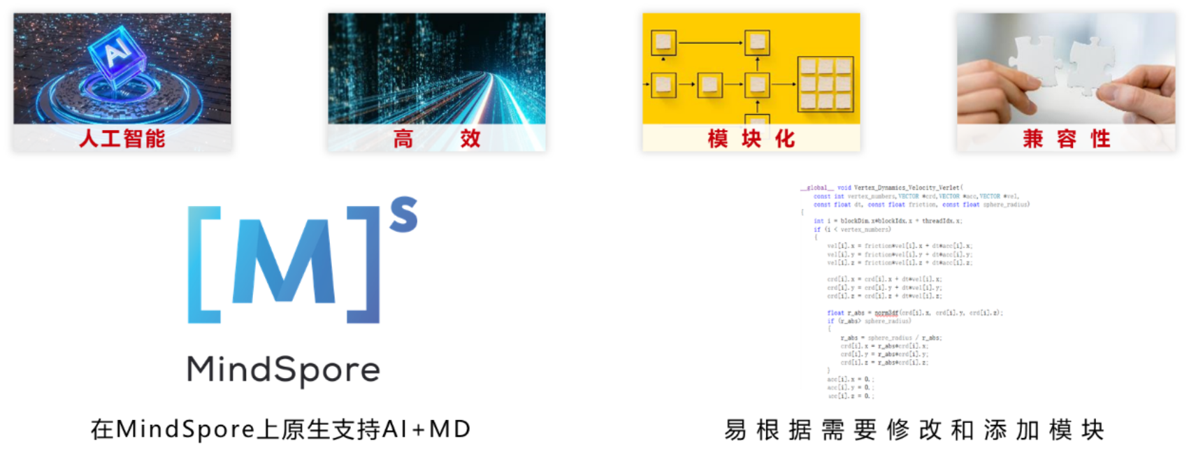 SPONGE首先面向基础理论研究的需要,不仅完全开源,在设计上也针对广大基础理论研究人员工作中的痛点,注重程序的模块化和开放性,使得用户可以方便地进行程序的个性化定制和二次开发。SPONGE同时也注重软件的兼容性和在应用上的便捷,内置多种转换工具、分析工具和模拟流程图形化设置界面等,帮助用户进行模拟体系迁移、结果分析和可视化呈现。在计算性能方面,SPONGE则在底层针对GPU进行了深度优化,具有媲美现有主流分子动力学模拟软件的计算速度,测试中对于具有40万原子的DNA水溶液体系,SPONGE可以达到20ns/天的计算速度(英伟达RTX 3090 单卡)。更为重要的是,SPONGE针对融合人工智能技术的下一代分子模拟,不仅提供Python语言接口以支持深度学习框架,更进一步与华为MindSpore开发团队深入合作,将SPONGE移植到了华为全场景人工智能框架MindSpore中,从而衍生出能与人工智能算法无缝融合的分子模拟库MindSponge,该分子模拟库已包含在MindSpore 1.2版本中发布。