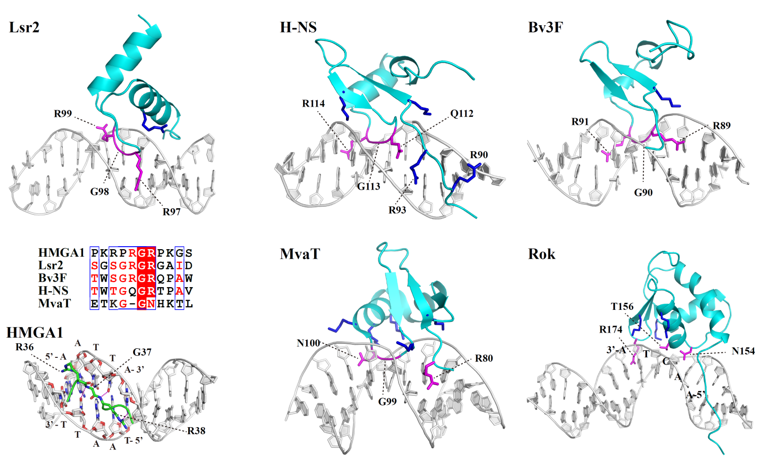 图2. 细菌外源基因沉默因子Lsr2、H-NS、Bv3F、MvaT及Rok 的DNA结合结构域的三维空间结构及其DNA识别机制