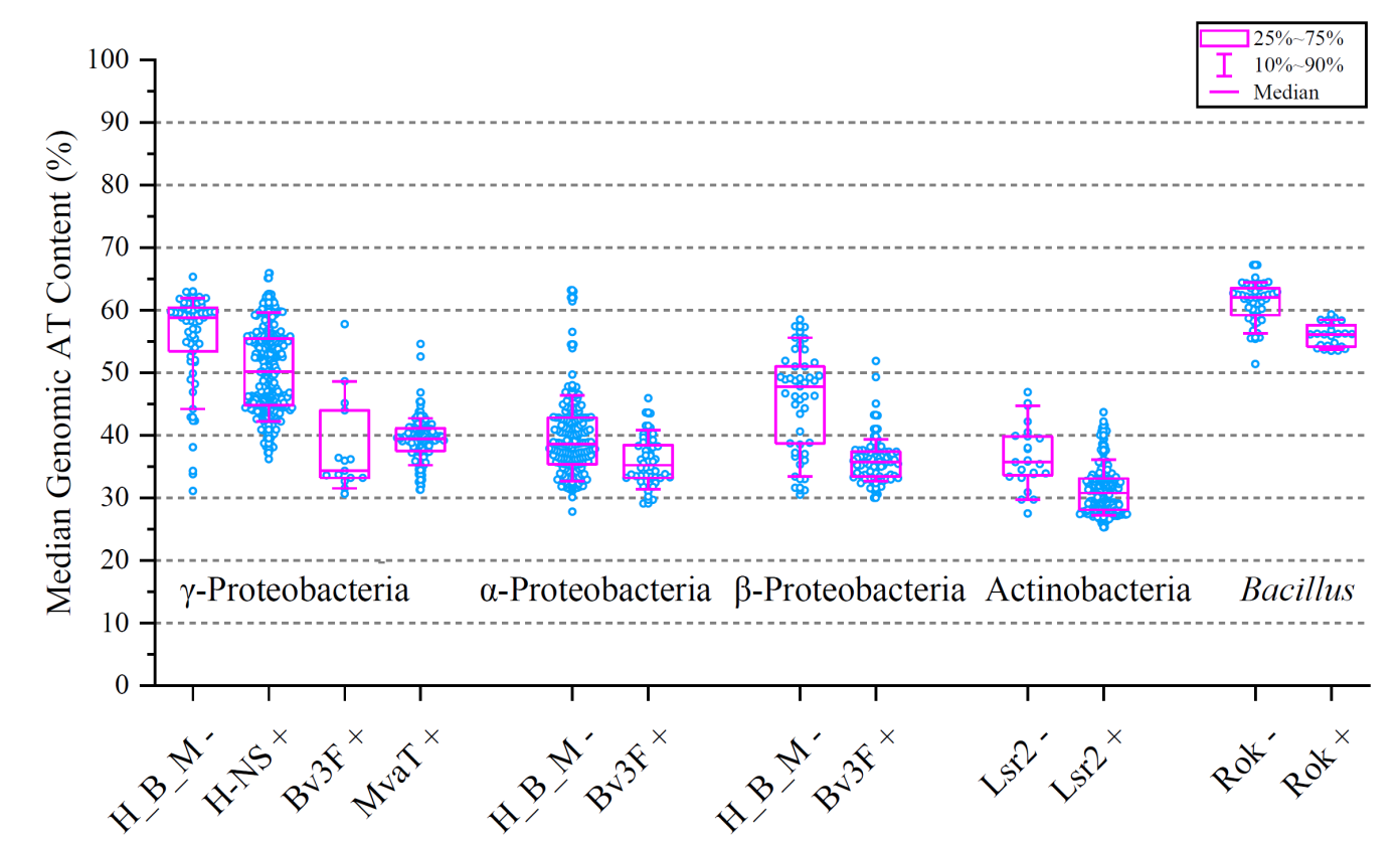 图3. 外源基因沉默因子H-NS、Bv3F、MvaT、Lsr2和Rok所在细菌的基因组AT碱基含量分布比较