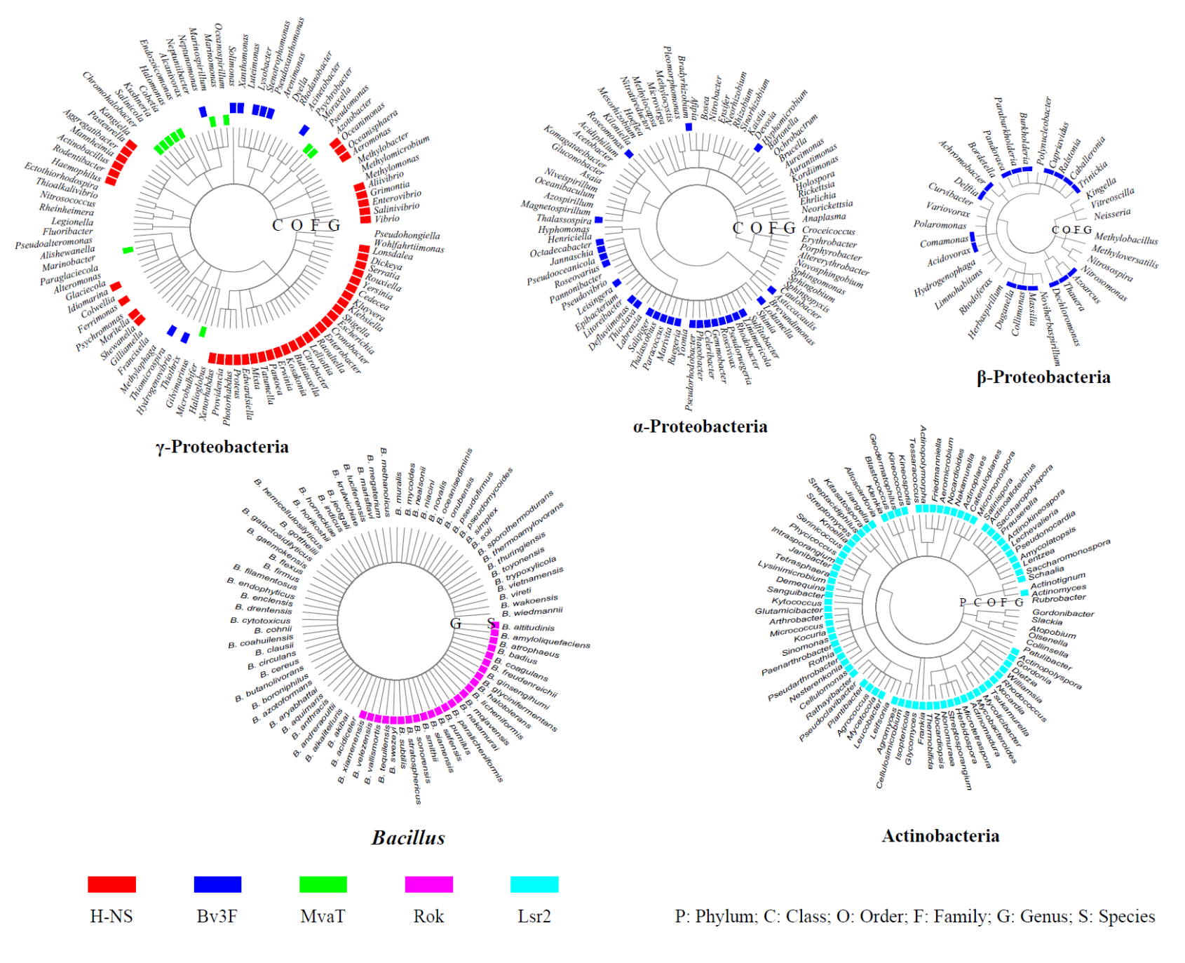 图1. 外源基因沉默因子H-NS、Bv3F、MvaT、Rok和Lsr2在不同细菌中的分布