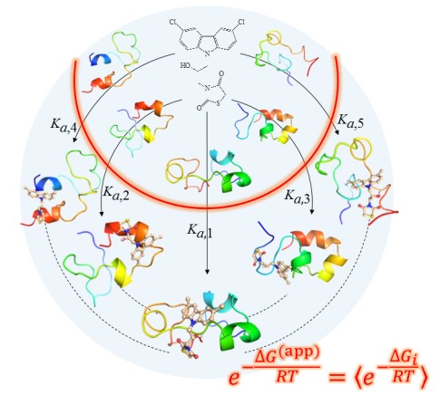 天然无序蛋白质(Intrinsically Disordered Proteins)没有固定的三维结构,却具有正常的生物学功能,不但是对蛋白质“结构-功能”传统范式的重要补充,而且因其与多种疾病密切相关而成为重要的潜在药物靶标。无序蛋白与小分子的相互作用机制与传统的有序蛋白迥然不同,在生理条件下是以包含很多不同构象的系综形式存在的,单单针对某一个构象设计药物并不能保证对整个无序蛋白系综的结合有效性。如果对系综中的所有构象进行分子对接,再结合统计热力学原理将对接结果综合起来,理论上是可以得到药物配体与无序蛋白的结合亲和力(J. Chem. Inf. Model. 2020, 60, 4967)(图3)。但是,与传统的药物设计流程相比,这种做法的计算量将暴增成千上万倍,这在实际应用中是无法接受的。那么,有没有可能存在某种算法,既能够大大降低计算量,又能保持较高的筛选性能?