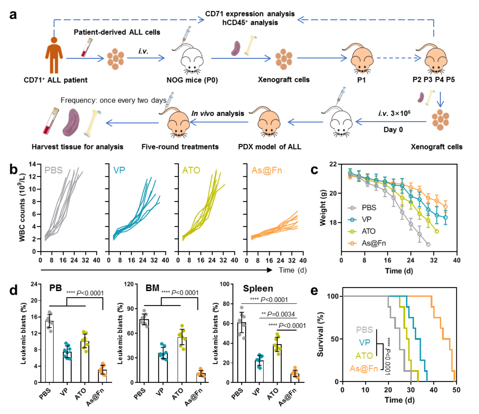 图1:As@Fn在病人来源白血病异种移植模型上的疗效:(a)白血病PDX模型构建及药效分析示意图;(b)不同治疗组小鼠白细胞变化曲线;(c)不同治疗组小鼠体重变化曲线;(d)不同治疗组小鼠外周血(PB)、骨髓(BM)和脾脏中白血病细胞的比例;(e)不同治疗组小鼠的生存曲线