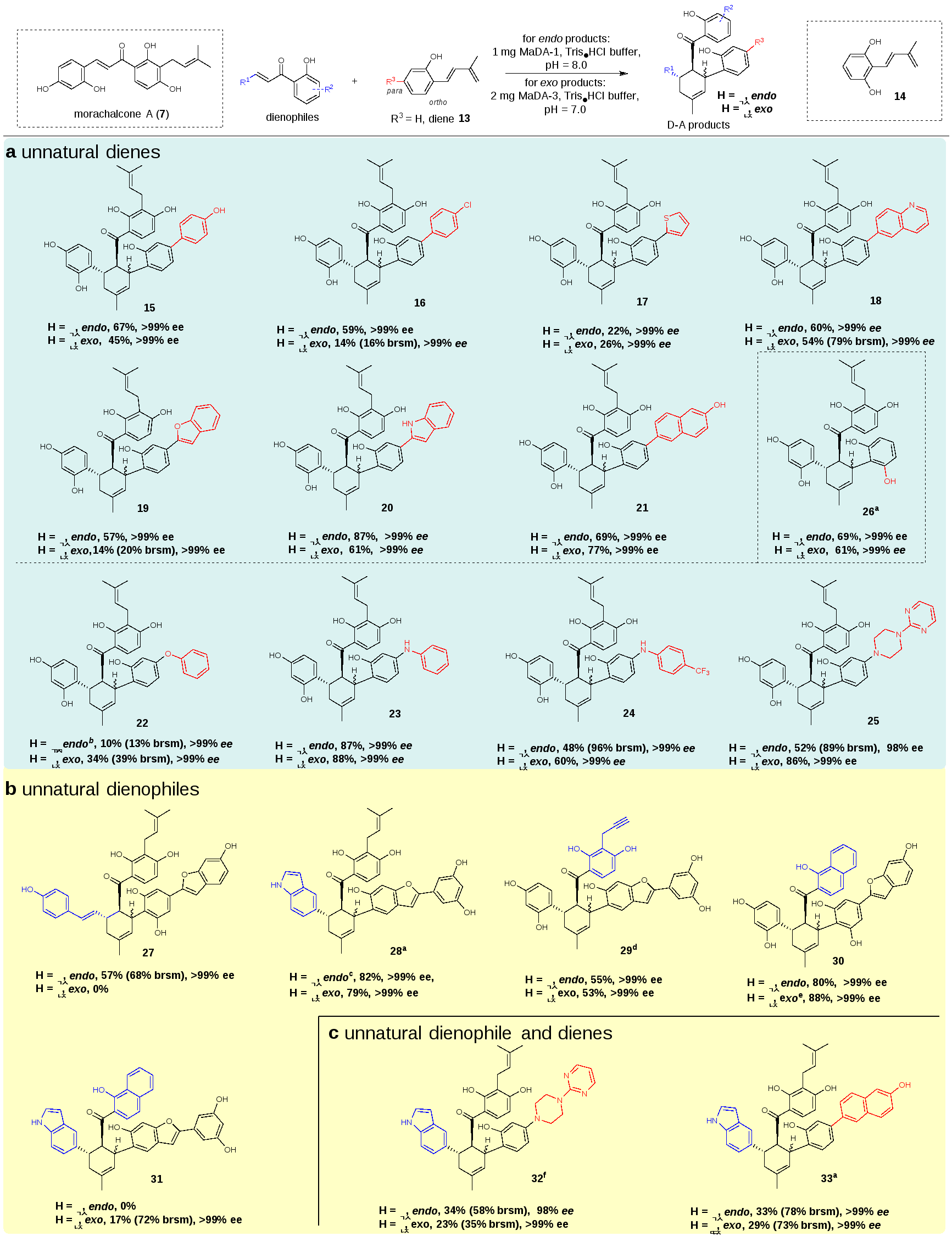 受到桑科植物中D-A类型天然产物生物合成的启发,作者从白桑中挖掘和鉴定到两类FAD依赖蛋白,其中一类FAD依赖蛋白(MaDA-1)具有与已知endo选择性D-A反应酶MaDA相同的功能,而另一类FAD依赖蛋白(MaDA-2和MaDA-3)催化了罕见的exo选择性的分子间D-A反应。作者还系统性探索了这两种选择性分子间D-A反应酶的底物适用范围,并利用它们实现了一系列天然和非天然D-A产物的高效精准合成,如图1所示。