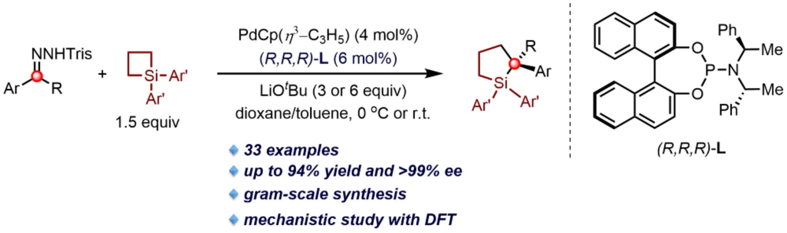 王剑波课题组在卡宾偶联研究方面的另一项重要进展是钯催化的卡宾对碳硅键的不对称插入反应。含硅有机化合物在医药,材料等领域具有广泛应用,因此如何高效、高选择性地构建碳硅键是重要的研究课题。过渡金属催化的卡宾对Si-H键的插入反应是构建碳硅键的一种简单高效的方法,因此相应的卡宾对Si-C键的插入无疑是另外一种新颖高效的构建碳硅键的方法。然而,这种类型的催化反应至今未曾实现,其对映选择性控制将会是更大的挑战。该研究团队采用分步的“氧化加成-卡宾转移插入-还原消除”策略成功实现了钯催化的卡宾对碳硅键的不对称插入,为含有三级或四级手性碳中心的硅杂环戊烷的合成提供了一种新颖高效的方法。通过DFT理论计算,对反应机理及控制立体选择性的关键因素进行了深入的探讨(J. Am. Chem. Soc. 2021, 143, 12968.)。