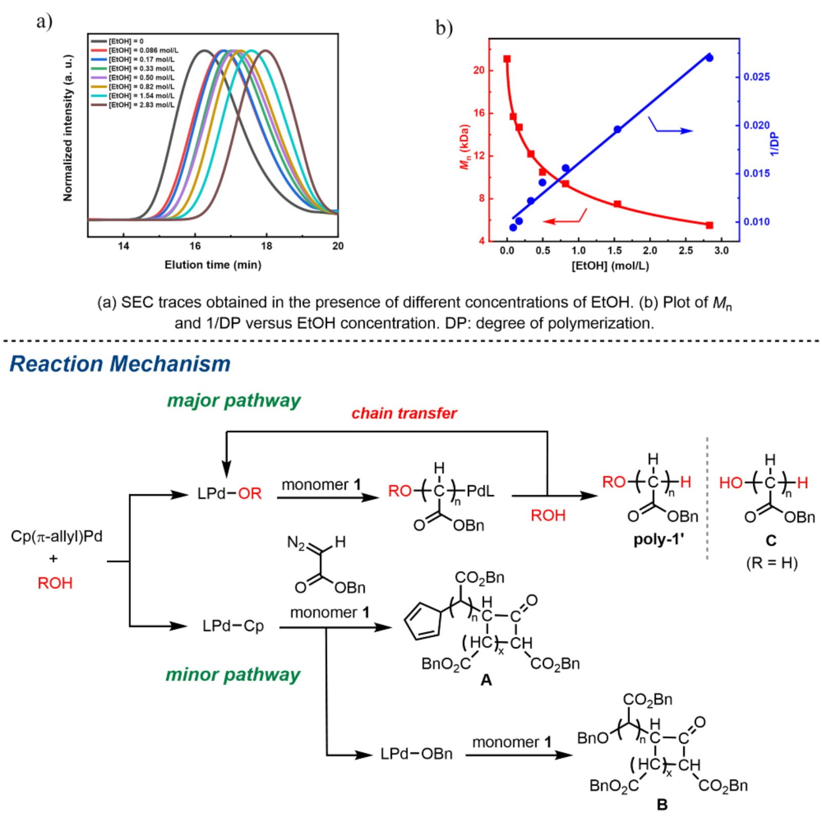 动力学研究表明在聚合反应的初期,分子量就增长到最大值,并且随着转化率的增加,一直保持在最大值附近,说明反应具有慢引发、快增长的特点。该反应与单体呈现一级动力学关系。此外,还发现当向反应体系中加入水或者小分子醇类时,聚合物分子量明显下降。向体系中加入不同浓度的乙醇时,可以得到不同分子量的聚合物。随着乙醇浓度的增加,聚合物分子量呈现逐渐下降的趋势,并与聚合度的倒数呈现线形关系。通过MALDI-TOF-MS 进一步证实,当加入乙醇时,得到的聚合物的端基分别是乙氧基和氢。以上结果说明乙醇可以作为链转移试剂,通过调控乙醇的浓度可以得到不同分子量的聚合物。通过上述实验,该团队提出了相应的反应机理(Macromolecules 2021, 54, 10914.)。