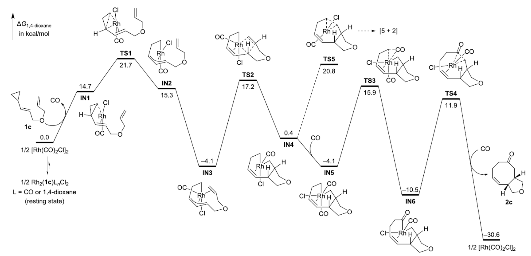 图4. [5+2+1]环加成反应在DLPNO-CCSD(T)/def2-TZVPP:SMD(1,4-dioxane)//BMK/def2-SVP水平下计算得到的吉布斯自由能面 (图片来源:JACS)。