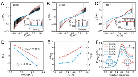 在100 K至140 K下,在分子结的伏安特性曲线的较高偏压位置,发现了四个独立电导态的裂分,进一步对分子结电流进行实时监测,发现了相互转化的四个电导态。由于分子结中分子的对称性,确定新增的两个电导态来自于下图4B中的两个对称结构。通过对四稳态时序的进一步分析,得到了其中的相互转化关系,结合理论计算给出了每一步反应相应的活化能。