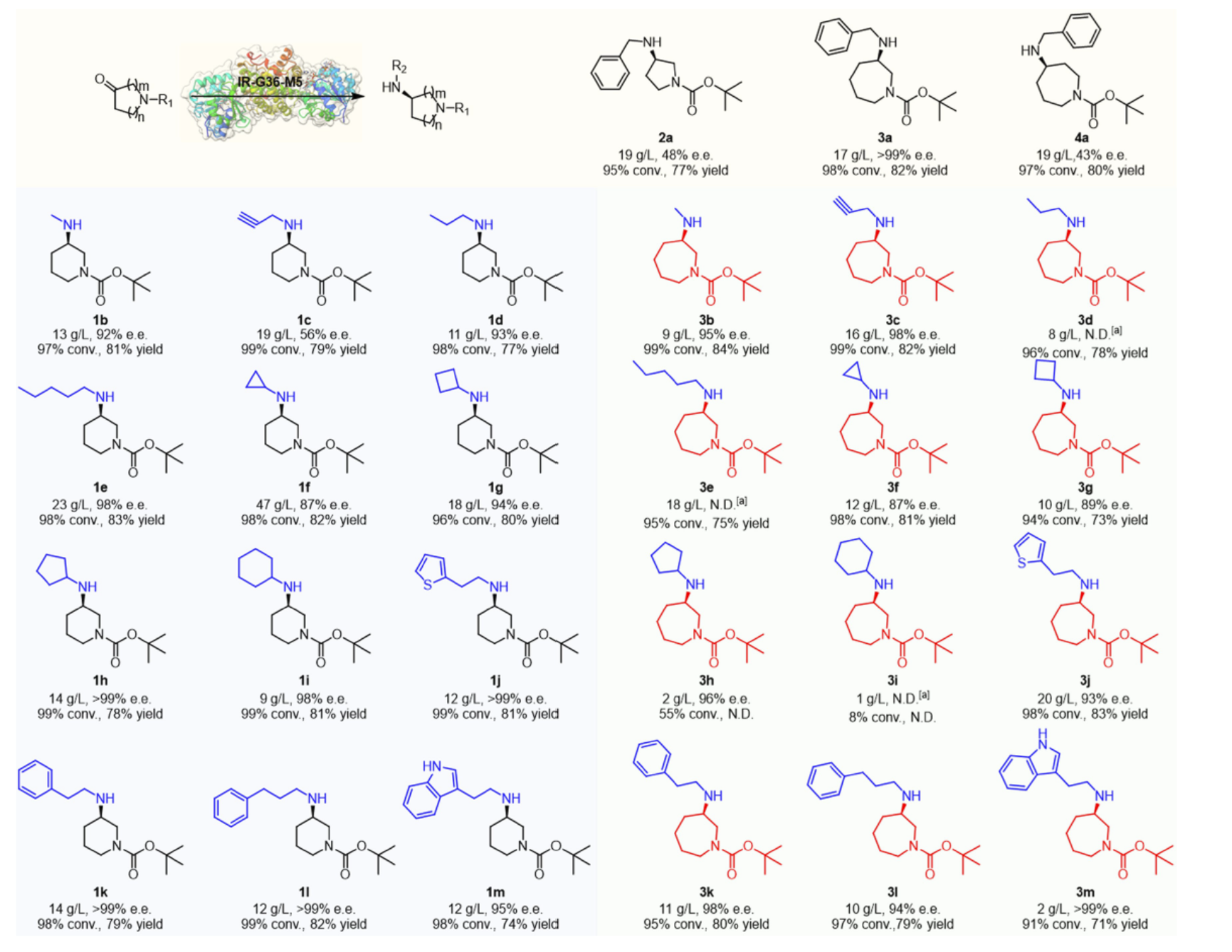 为了扩展亚胺还原酶的应用范围,研究人员利用突变体M5完成了不同氮杂环酮与多个胺供体的制备级反应,并且展现出优异的催化效率和立体选择性。同时,作者利用M5的实现了模式底物的百克级生物转化,在24.9 g/L底物浓度下,转化率达到97%,时空产率高达35.3 g L-1 d-1。