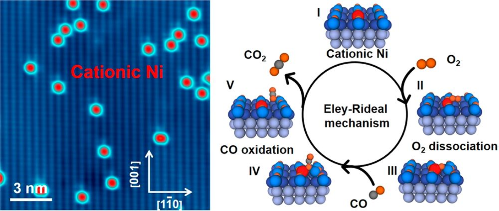 研究团队以Cu(110)上制备的单层CuO薄膜为载体,通过在较高温度(370 K)沉积Ni原子的方式制备了Ni单离子模型催化体系。研究发现不同化学态的Ni单原子在CO氧化反应中表现出明显差异。首先,金属态Ni原子上CO脱附温度高达400 K,而离子态Ni原子几乎不吸附CO。其次,Ni离子对O2的解离吸附具有很高的活性。室温条件下,O2在Ni离子上化学解离形成“Ni-O”物种。解离后的O原子具有很强的化学活泼性,能与气相CO直接反应产生CO2。以上结果表明Ni单离子催化的CO氧化反应遵循 Eley-Rideal 机理,与金属态Ni原子上CO氧化时所遵循的Mars-van Krevelen机理显然不同。具体的反应过程:CO在Ni离子(I)上不发生吸附,而O2在Ni离子上被活化(II)并解离形成“Ni-O”物种 (III),“Ni-O”物种中的O原子与来自气相(IV)的CO反应形成CO2 (V),完成催化氧化过程。该研究详细表征和分析了离子态和金属态的Ni单原子对CO氧化反应的催化性质异同,有助于人们深入认识和理解多相催化中的单原子催化机制和表面化学中单金属离子的化学性质。