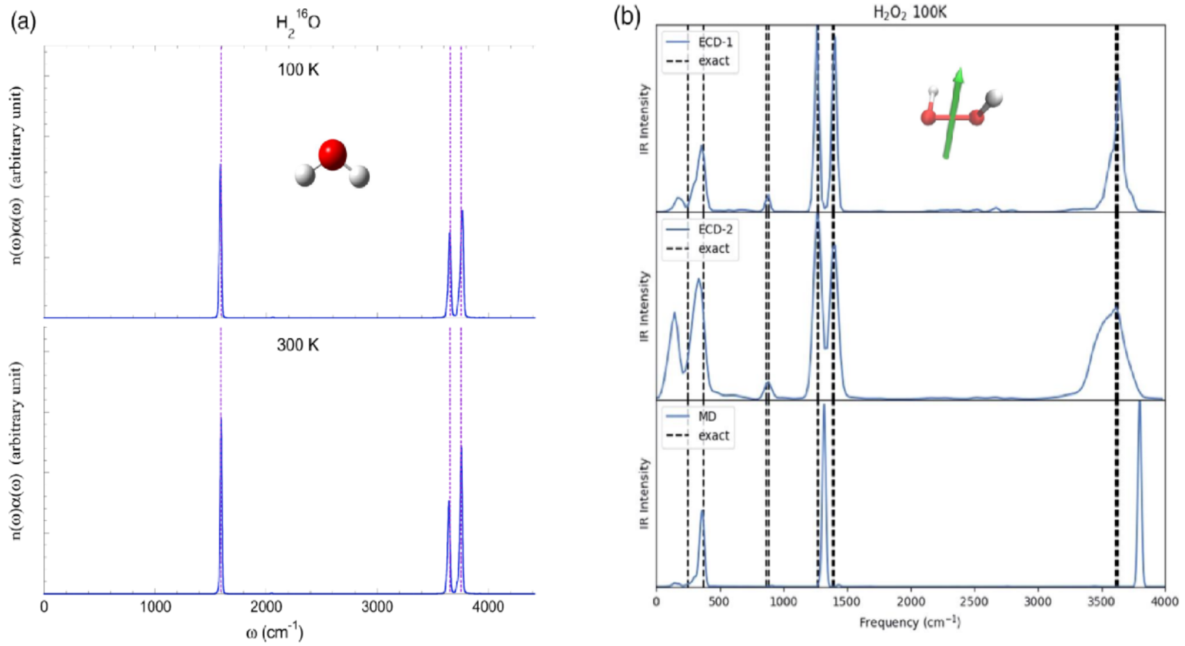 图2:基于Wigner相空间的轨线动力学对于水/过氧化氢分子红外光谱的模拟结果。