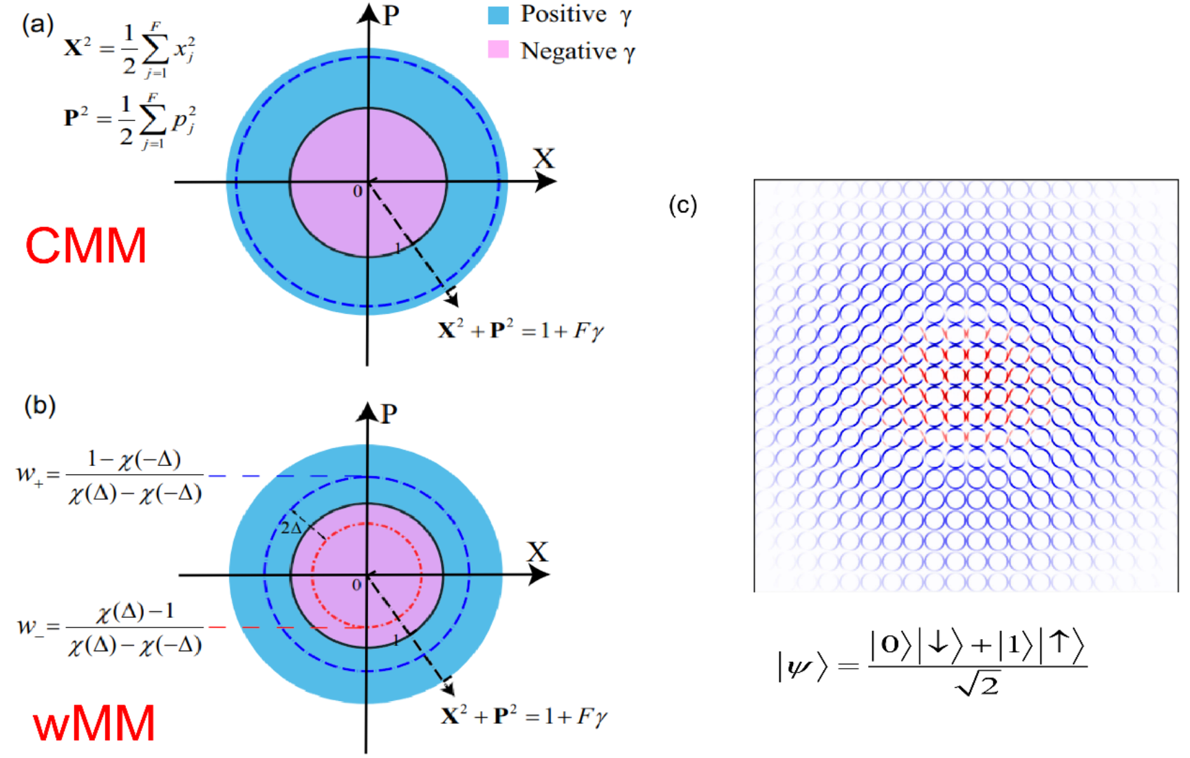 图3:(a)-(b)分别为电子态映射的约束位置-动量相空间CMM和wMM的示意图。(c)是对于核与电子的混合比特的相空间可视化示意图,其中原子核采用了Wigner相空间而电子态采用了wMM相空间。