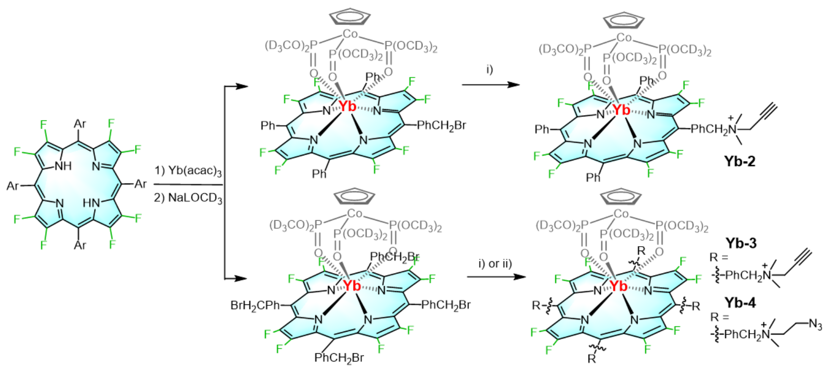 近二十年来,新型荧光显微成像技术帮助人们能够获取特定生物分子在时间和空间上的精细分布信息。其中,新型荧光探针在其中扮演着不可或缺的角色。近红外荧光成像(700–1700 nm)因其高组织穿透能力、低背景荧光等诸多优点愈加受到关注。然而,常见的NIR荧光团,如碳纳米管、半导体聚合物、量子点和花菁类有机染料等生物相容性差或存在化学和光稳定性低或量子产率低等缺点。稀土配合物发光源自禁阻的f-f跃迁,并具有锐利且长荧光寿命的特征发射峰,有望成为新一代近红外探针。北京大学化学与分子工程学院张俊龙课题组聚焦镱(Yb3+)配合物,发展了集NIR荧光成像和光动力疗法于一体的稀土探针(Chem. Soc. Rev., 2022, 51, 6177-6209)。但是,如何对细胞中生物分子进行特异性标记和成像仍具有挑战性。