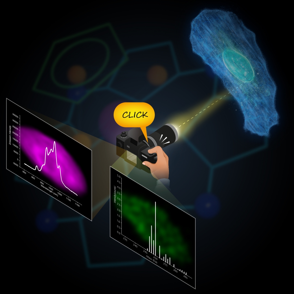 二次离子质谱 (SIMS),包括 NanoSIMS和ToF-SIMS,最近被广泛应用于植物、微生物和病理样品的分析与检测。然而生物大分子富含C、H、O、N等元素,缺乏特征片段或分子离子峰,SIMS应用于成像单细胞中特定生物大分子仍十分具有挑战性。相比而言,稀土元素的同位素选择范围广和在人体中自然丰度低等优点,在单细胞质谱成像领域具有独有的优势。因此,将该类稀土分子探针应用于细胞中DNA、RNA、蛋白质和聚糖的ToF-SIMS成像,实现NIR荧光成像和SIMS成像的结合,对细胞中新生DNA进行了双模态成像,展示了稀土在分子成像中的独特性。