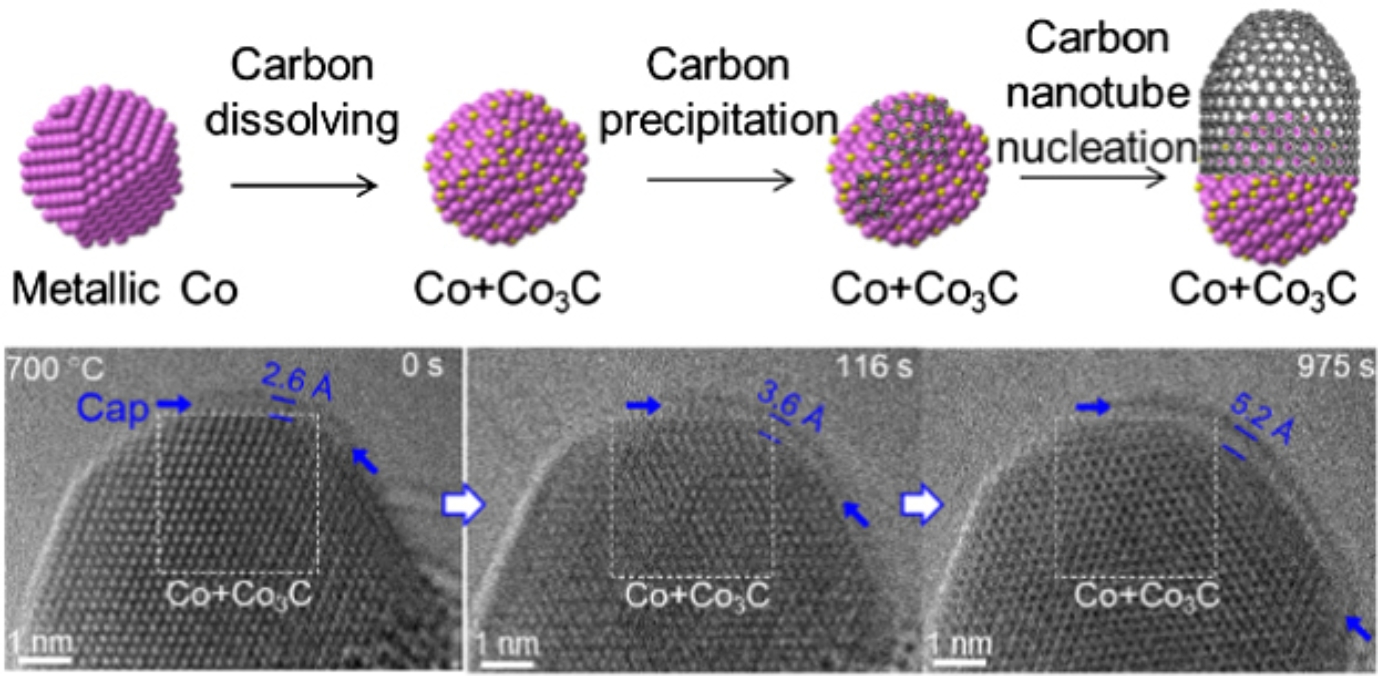 揭示单壁碳纳米管如何从活性催化剂纳米颗粒中成核是理解单壁碳纳米管生长机制的关键。李彦等借助ETEM和谱学表征,在亚埃层次上原位研究了在600-800 °C反应条件下,C在过渡金属Co催化剂近表面溶解和析出的动态结构演变过程,证实了Co-Co3C为碳管生长的活性催化物种,阐明了单壁碳纳米管在过渡金属催化剂表面成核和生长的机制(图3),为合理设计催化剂以高效控制碳纳米管生长提供了重要依据(CCS Chem. 2021, 3, 154)。