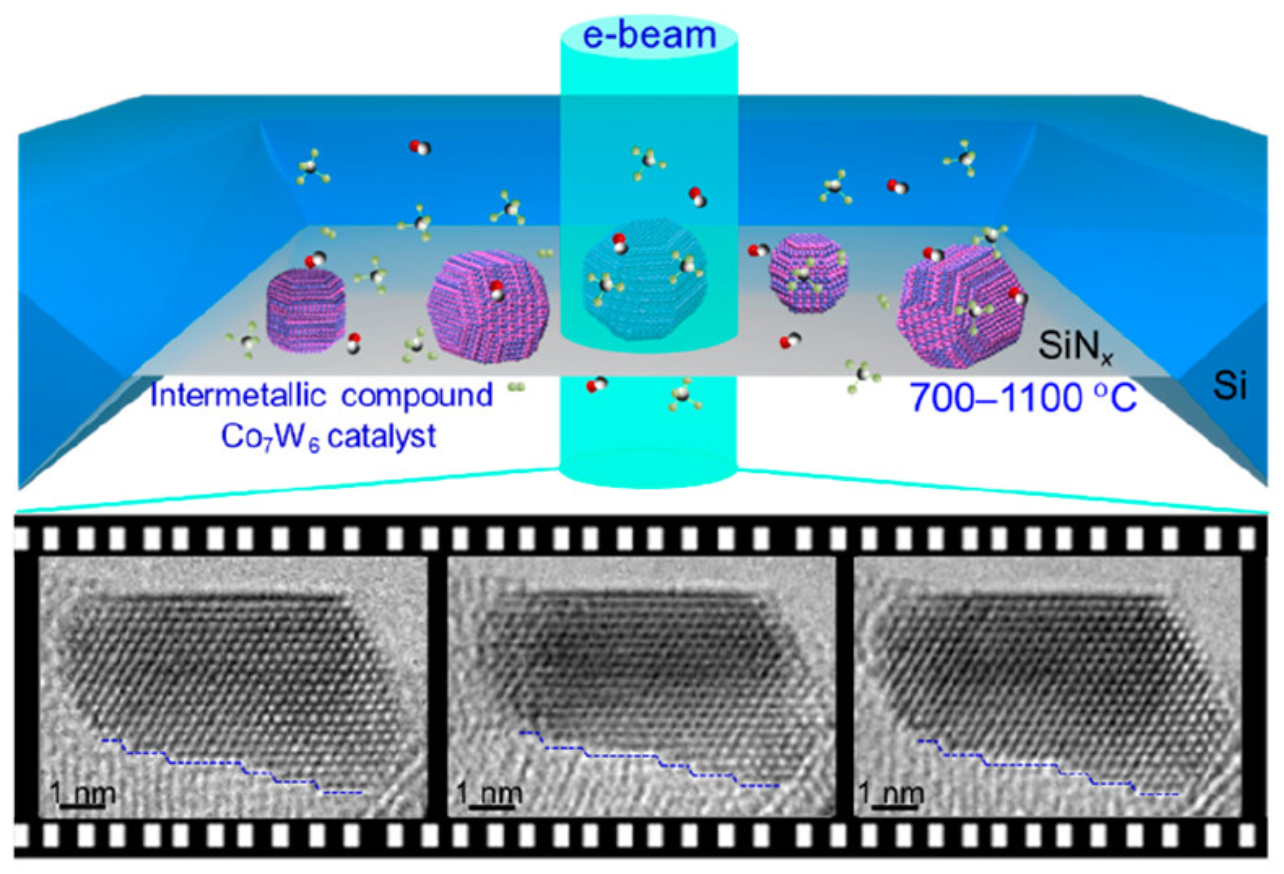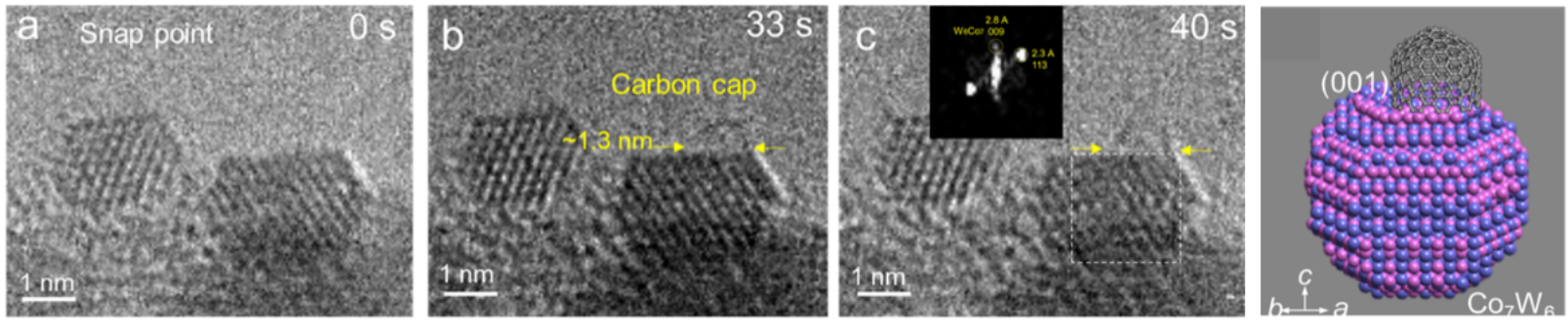 催化剂设计在单壁碳纳米管的结构可控生长中至关重要,在原子尺度直接观测供碳条件下催化剂的稳定性和动态演化对于阐明单壁碳纳米管选择性生长机制十分必要。李彦等采用原位ETEM结合原位同步辐射X射线吸收谱研究发现,在700-1100 °C的高温下,Co7W6纳米晶在甲烷、一氧化碳和氢气气氛中始终保持结构和化学稳定性(图2),为在CVD过程中提供结构模板作用成为了可能(J. Am. Chem. Soc. 2019, 141, 5871)。